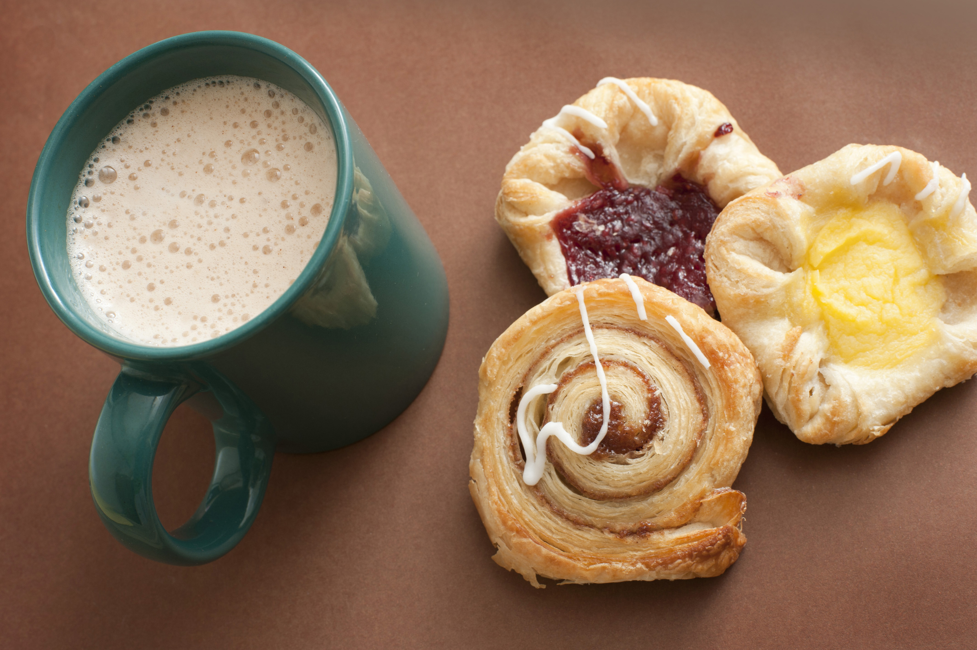 Keywords: cappuccino, cinnamon, coffee, coffee break, custard, danish, jam, mug, pastries, frothy, brown