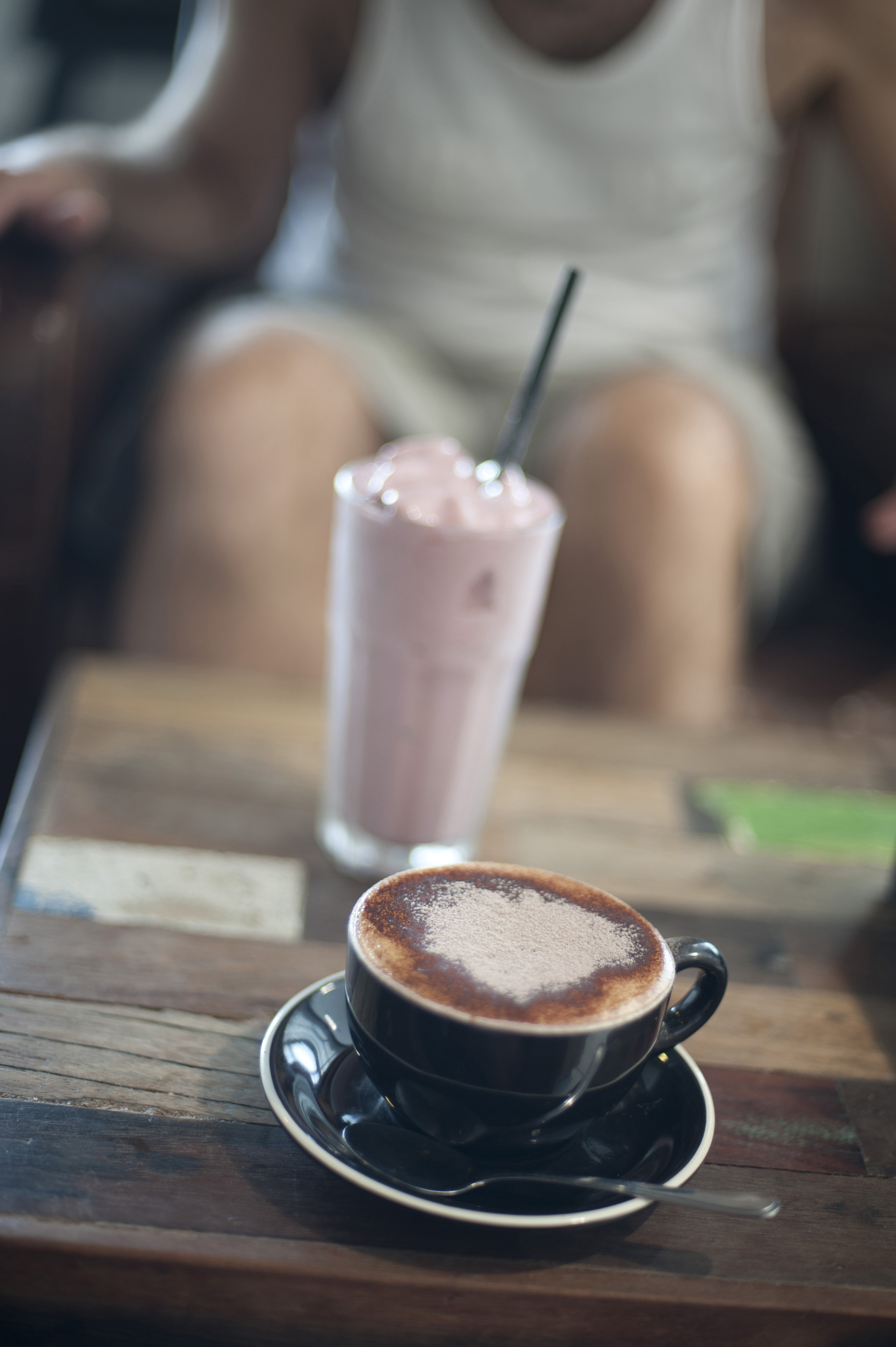 Cup of cappuccino and a milkshake on a table in a restaurant or cafeteria with a persons legs visible behind