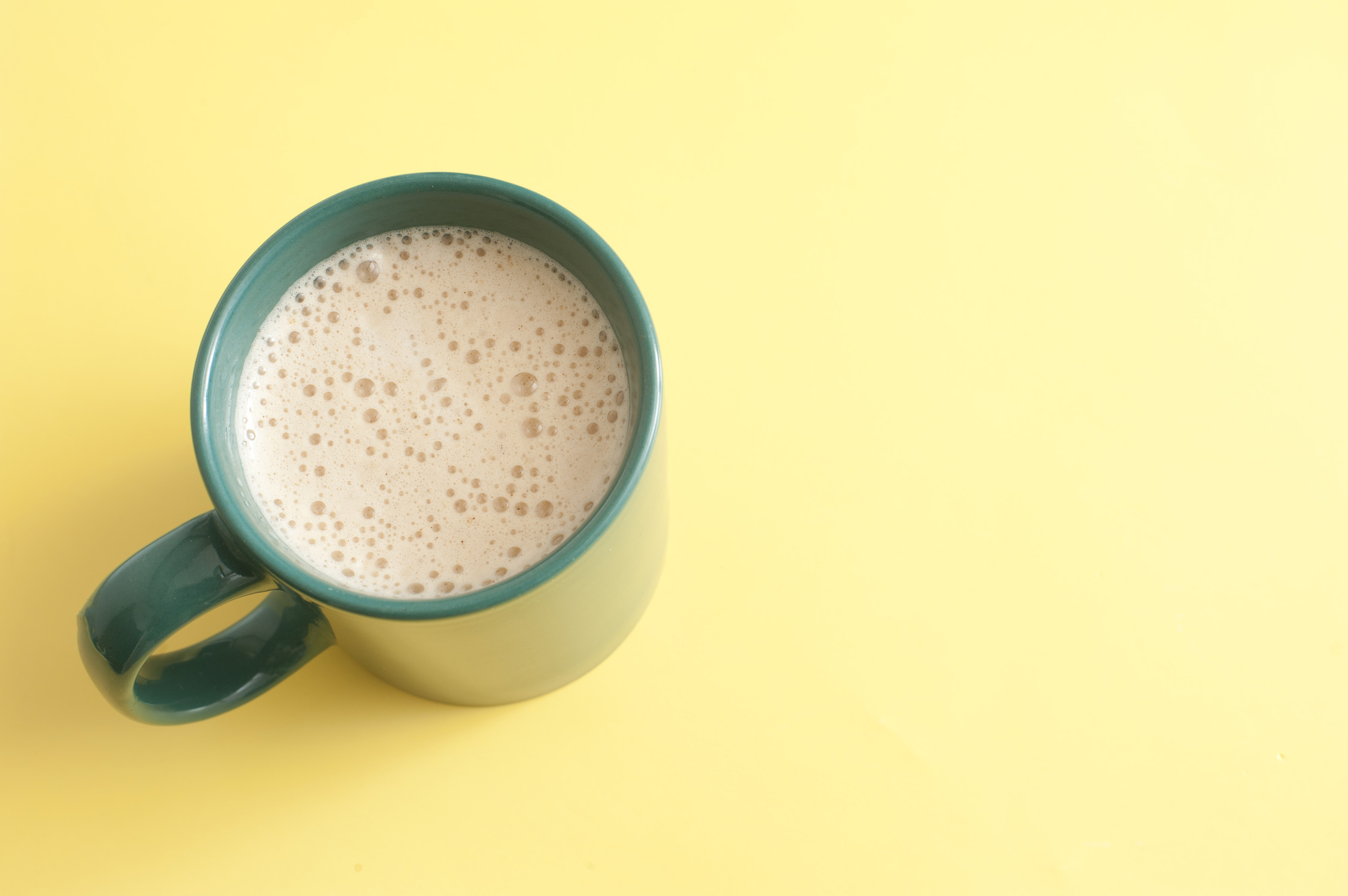 Mug of freshly poured frothy aromatic coffee or cappuccino for a refreshing coffee break viewed high angle on yellow with copyspace