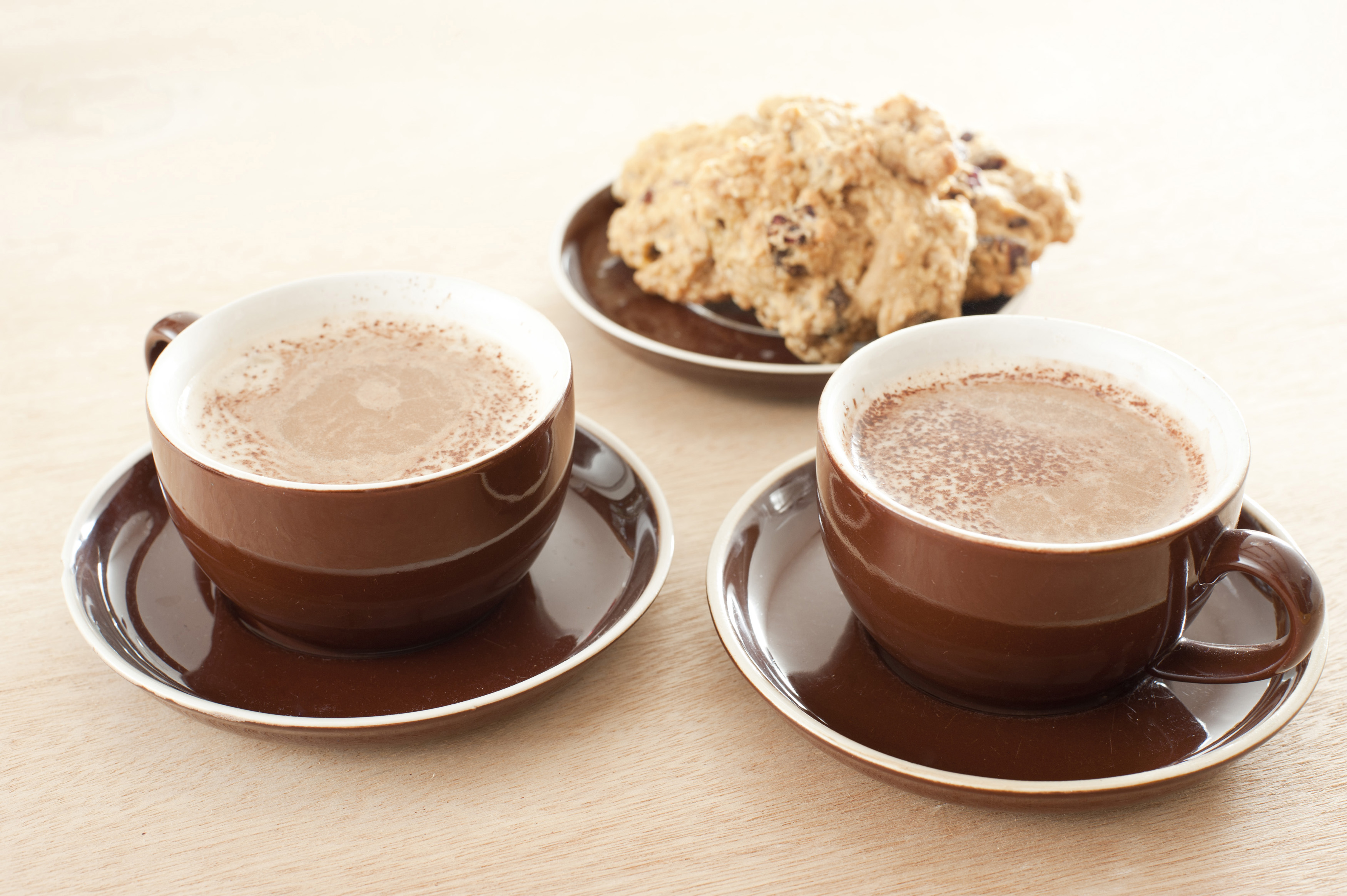 Keywords: beverage, drink, coffee, latte, treat, two, mug, chocolate, hot, scone, muffin, cappuccino, indulgent, temptation, morning, wooden