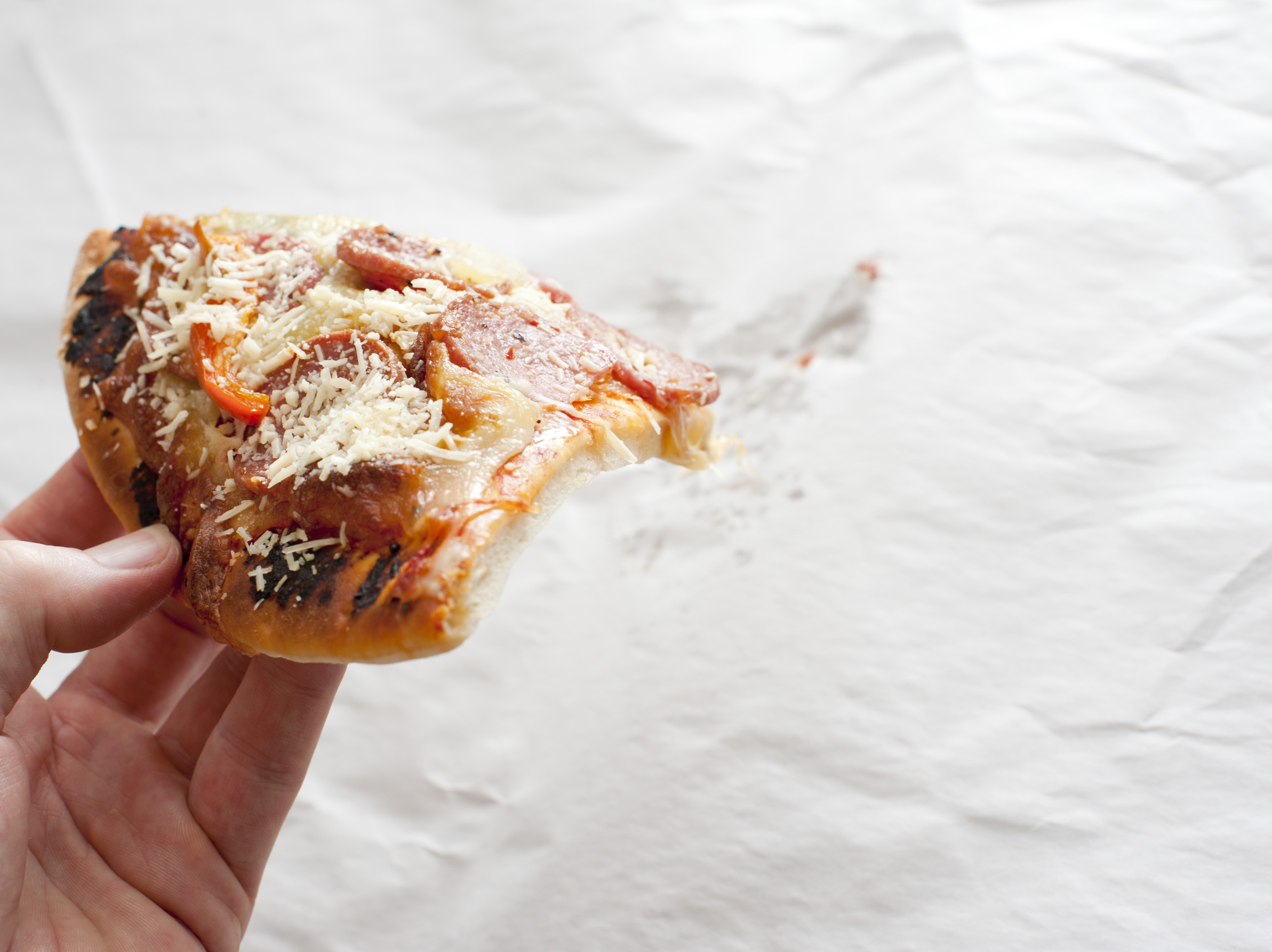 Keywords: cheese, first person perspective, food, greasy, hand, holding, pepperoni, pizza, snack, take out, cold, copy space, paper, junk food, stained, unappetising