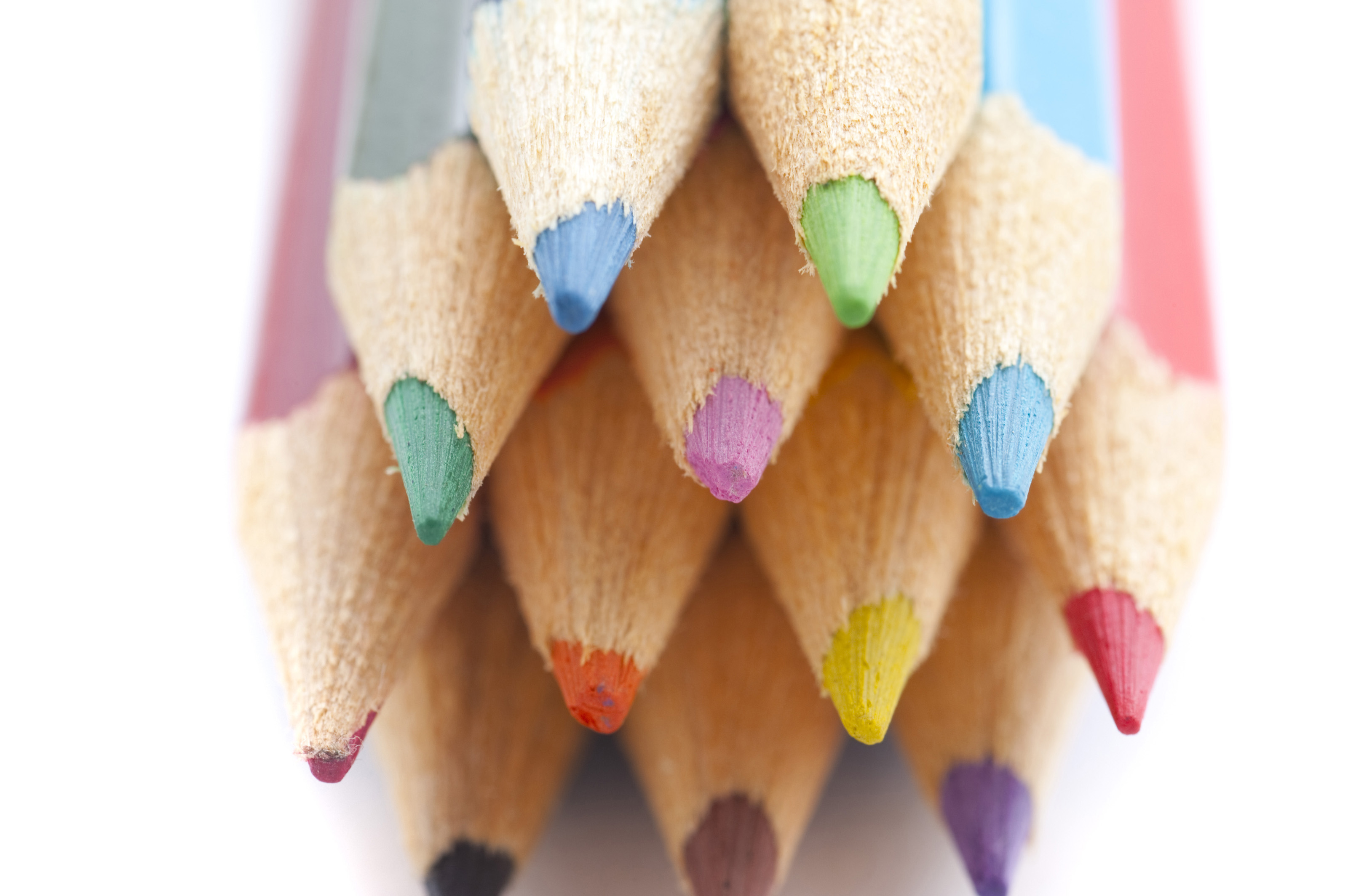 Artistic background of the colourful palette of pencil crayons with a close up view of the sharpened points facing the camera