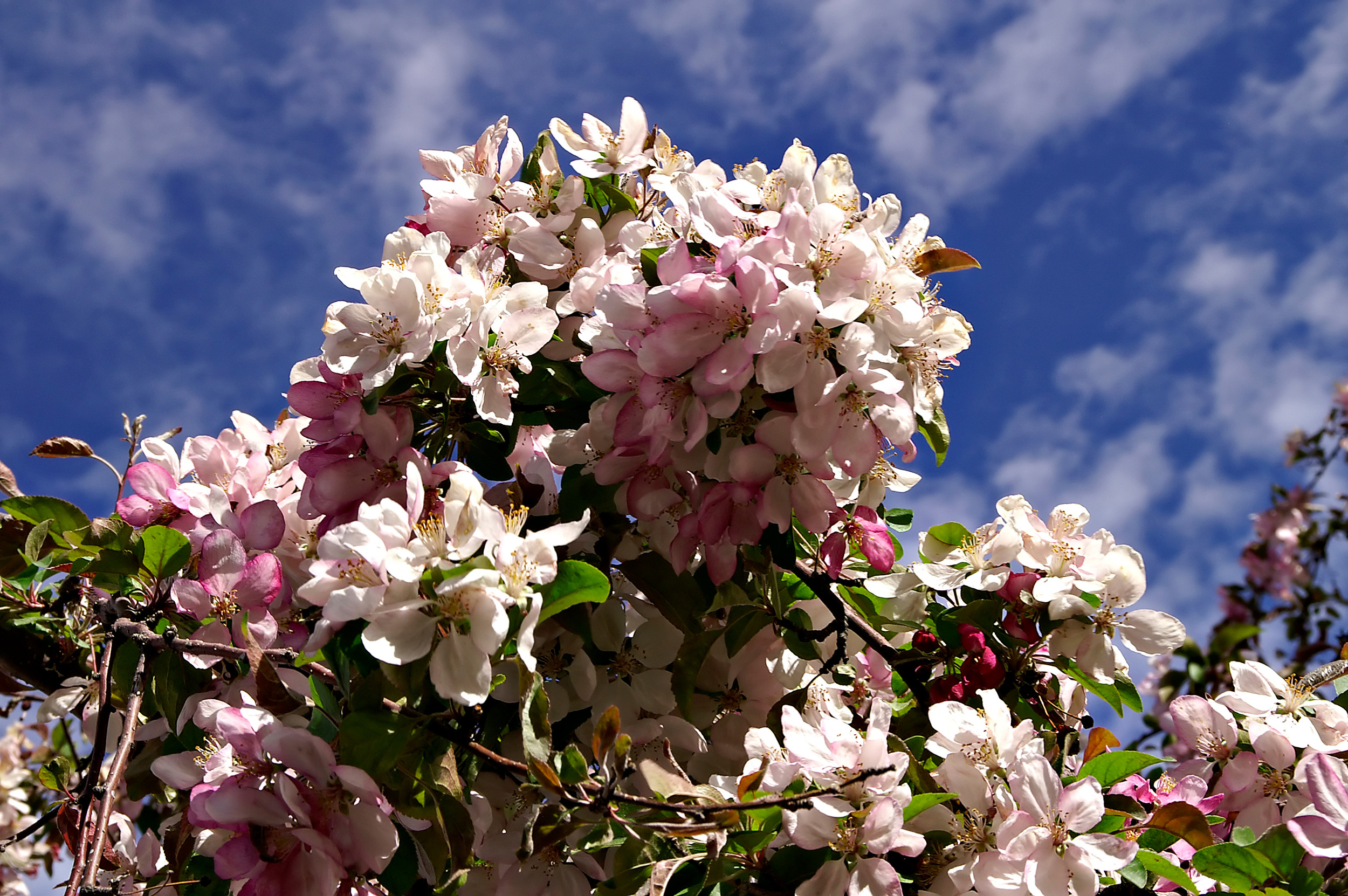 Keywords: Cherry, Blossoms, deep, blue, sky, partly, cloudy, blooms, blooming, april, spring, Denver, Colorado, flowering, tree, red, white, petals, clouds