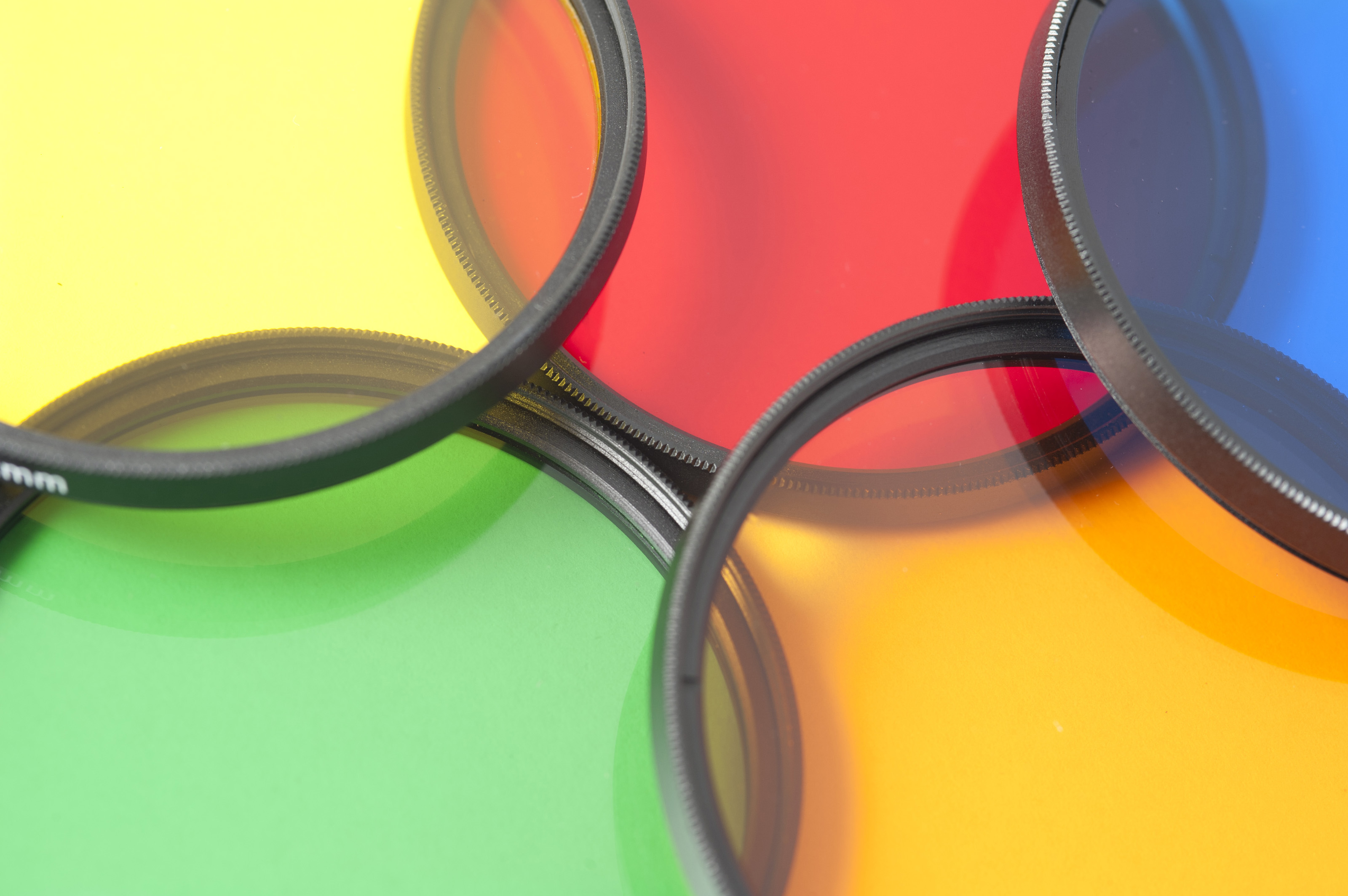 Extreme close up view on yellow, red, blue, green and orange contrast or polarizing filters for photography