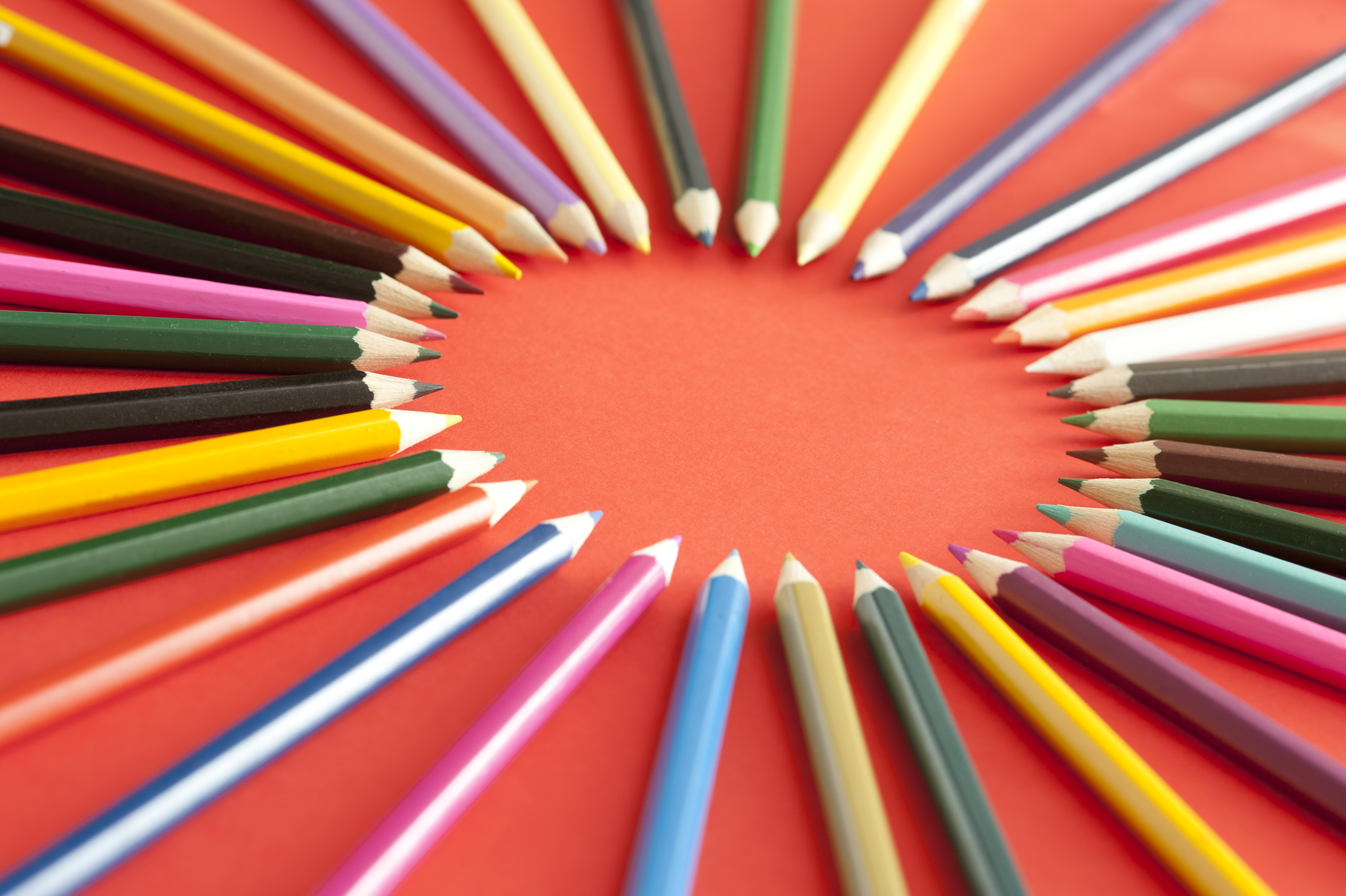 Various colored pencil tips facing each other and forming a ring over deep red background