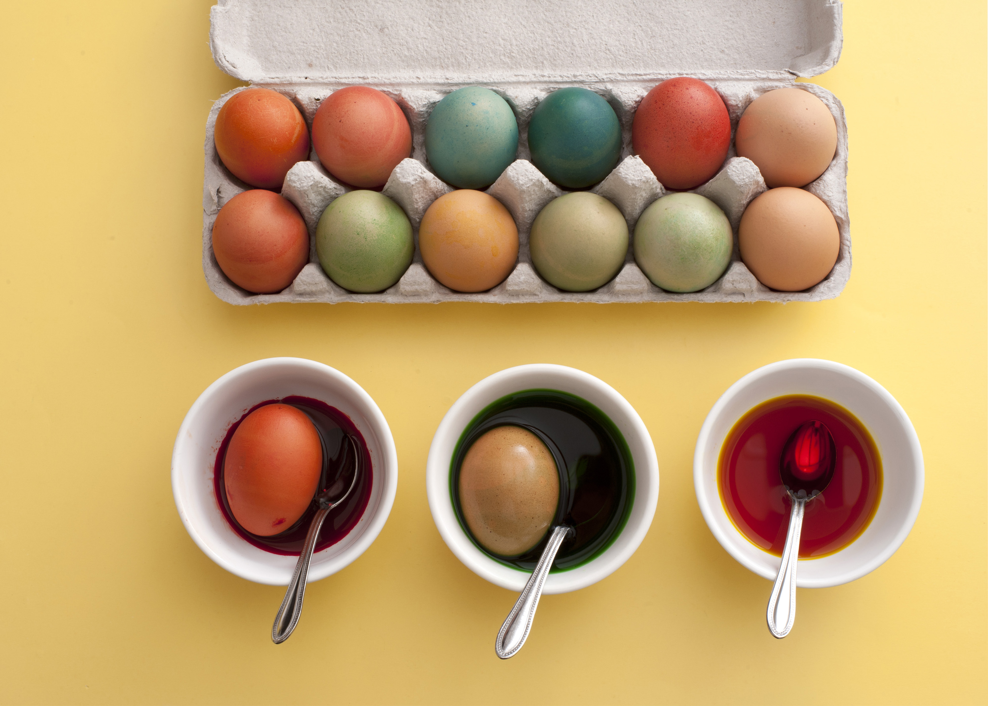 Keywords: colorful, dyed, easter, eggs, holiday, homemade, bowls, cardboard, carton, dye, full, overhead, preparing, kids, tradition