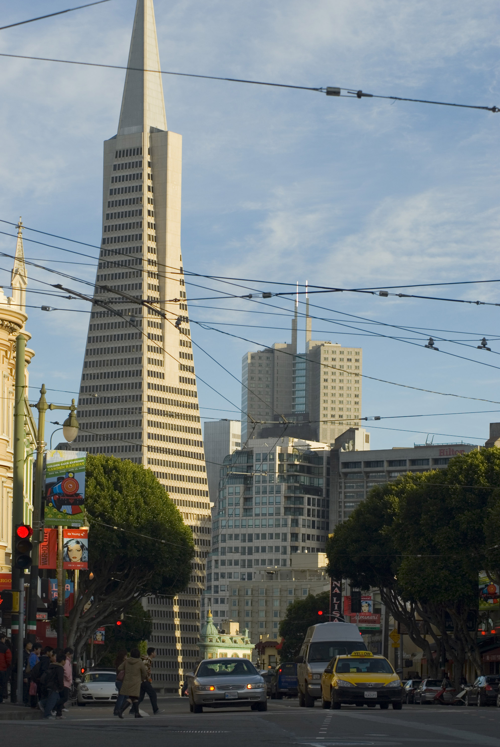 Keywords: street, urban, street scene, road, avenue, buildings, cars, traffic, street level, streetlevel, pyramid, transamerica, trolly bus, overhead wires, caternery, wire, trolly cables