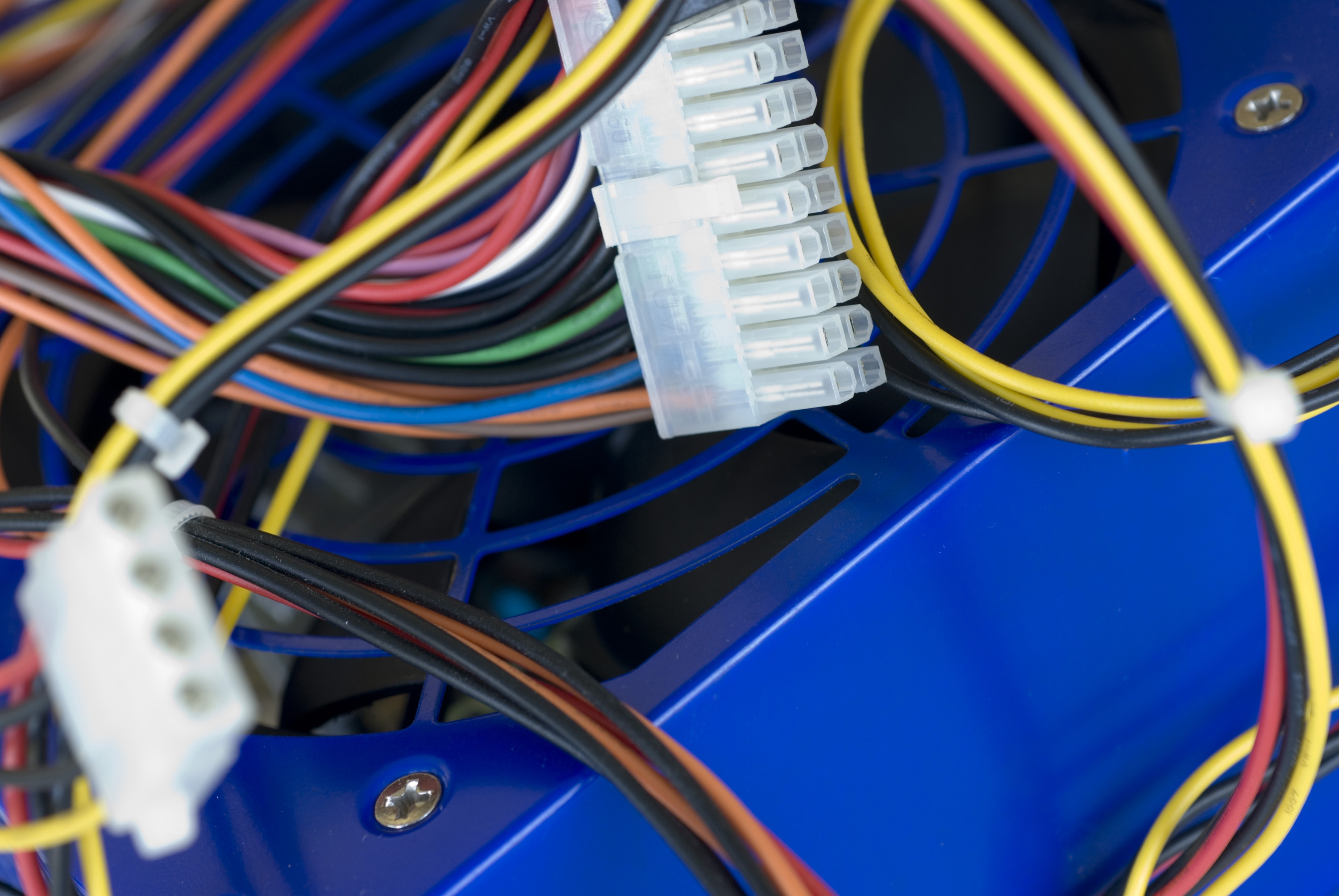 a tangle of power cables from inside a computer case