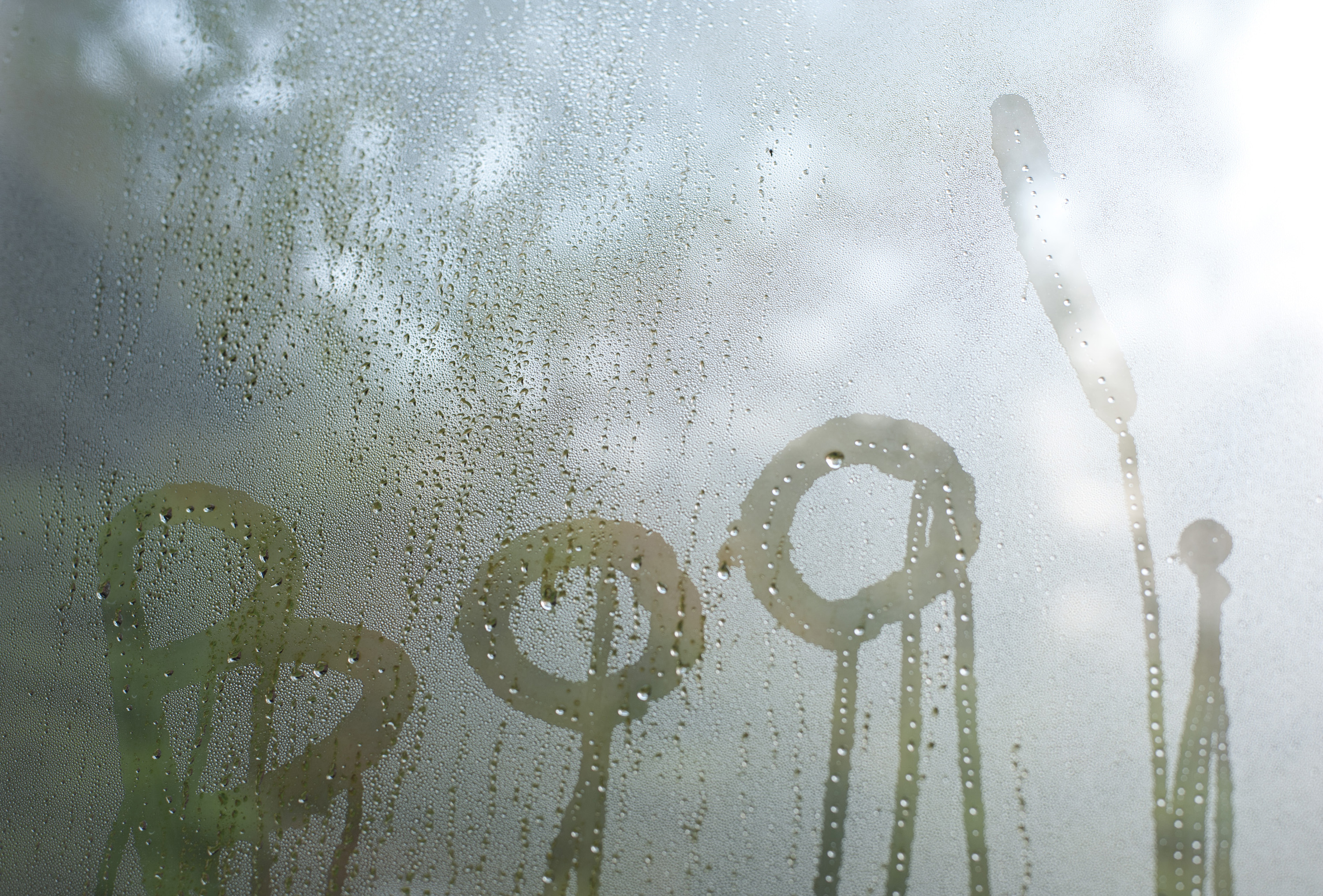 Boo - in dripping letters on cold condensation on window glass bathed in a ghostly white light as a backdrop for a Halloween greeting card or invitation
