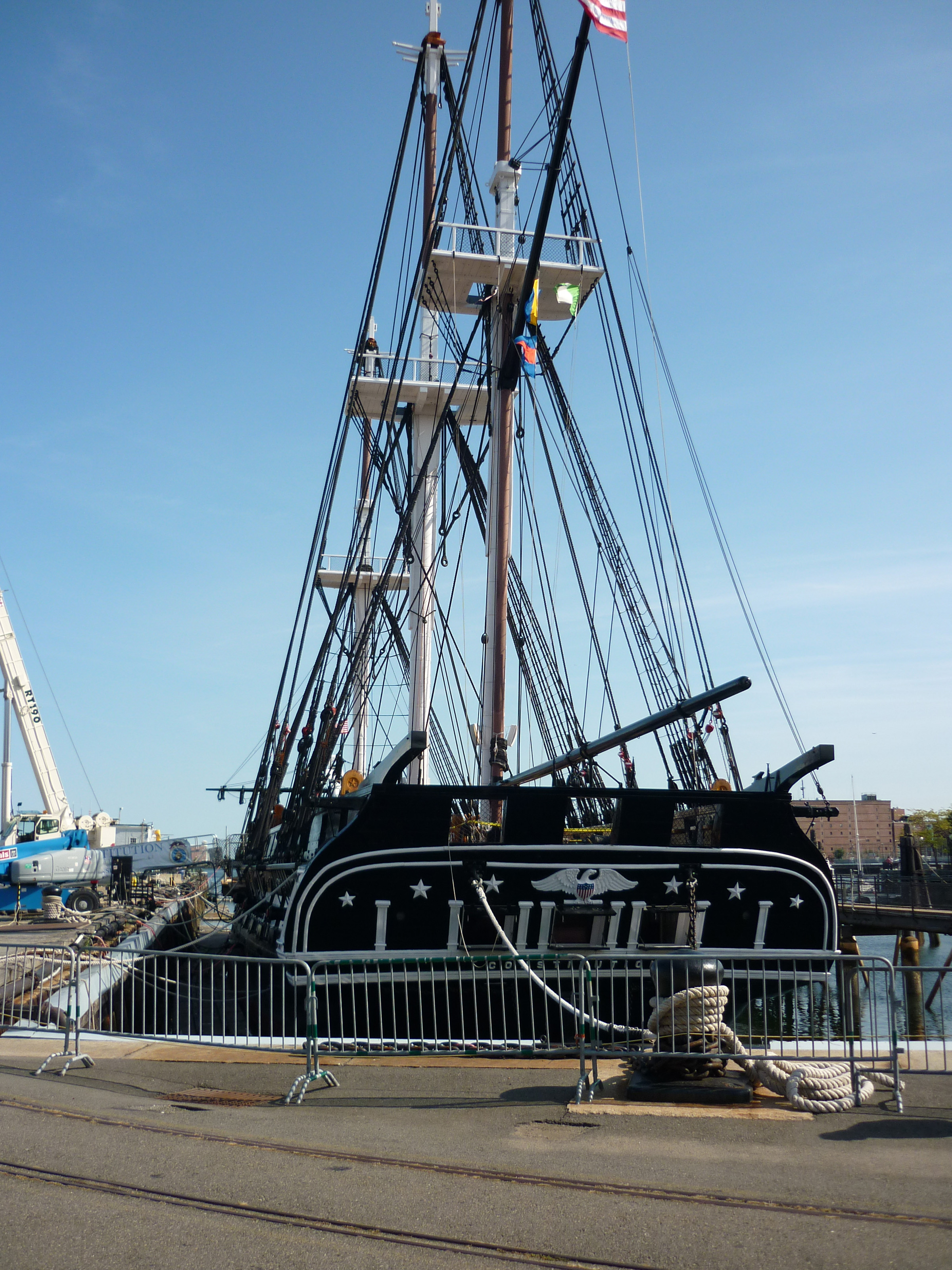 USS Constitution, a three-masted wooden frigate in the US Navy now classed as a museum ship tied to the wharf