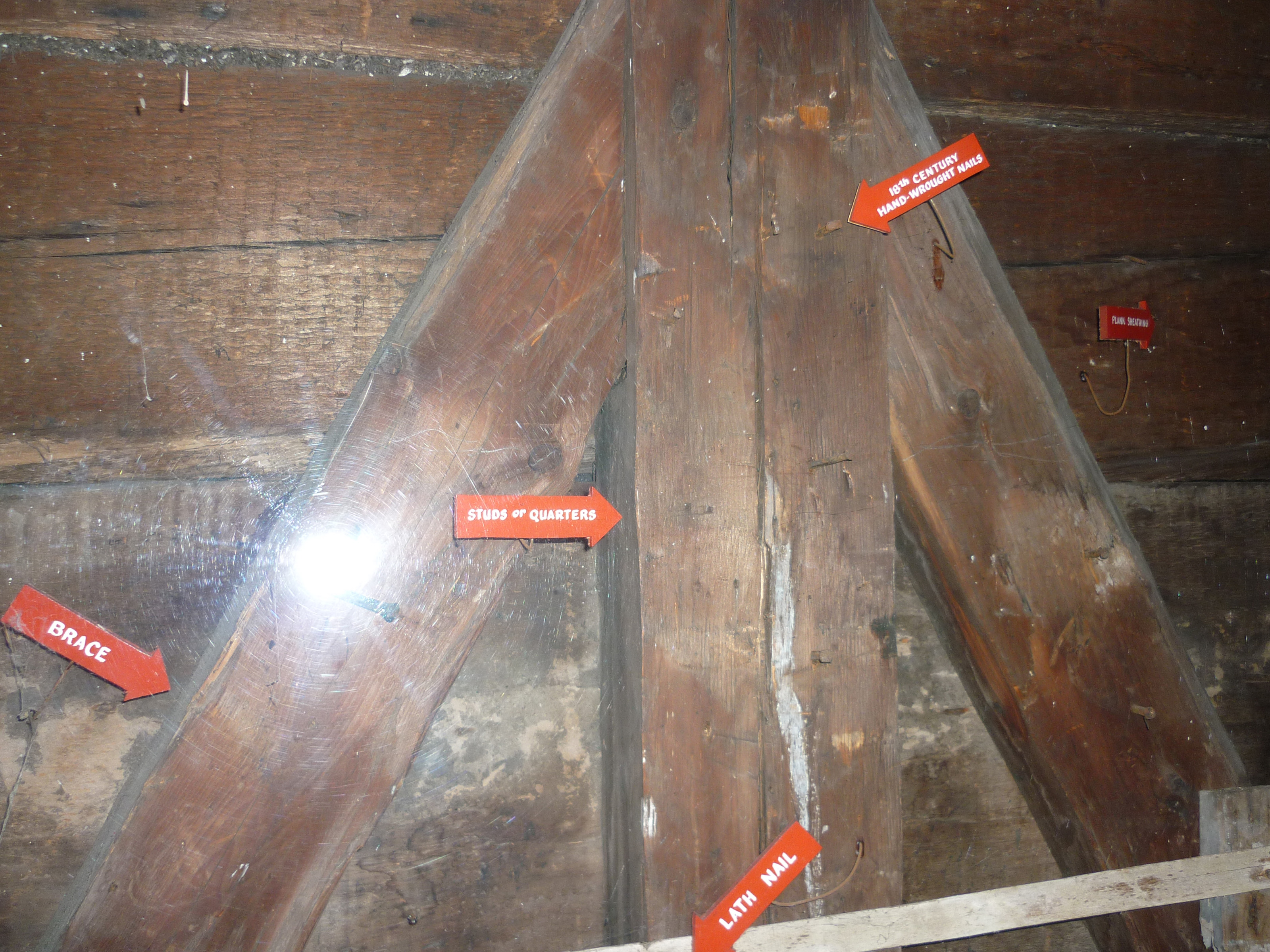 Details of the structure of a wooden building with studs and braces highlighted