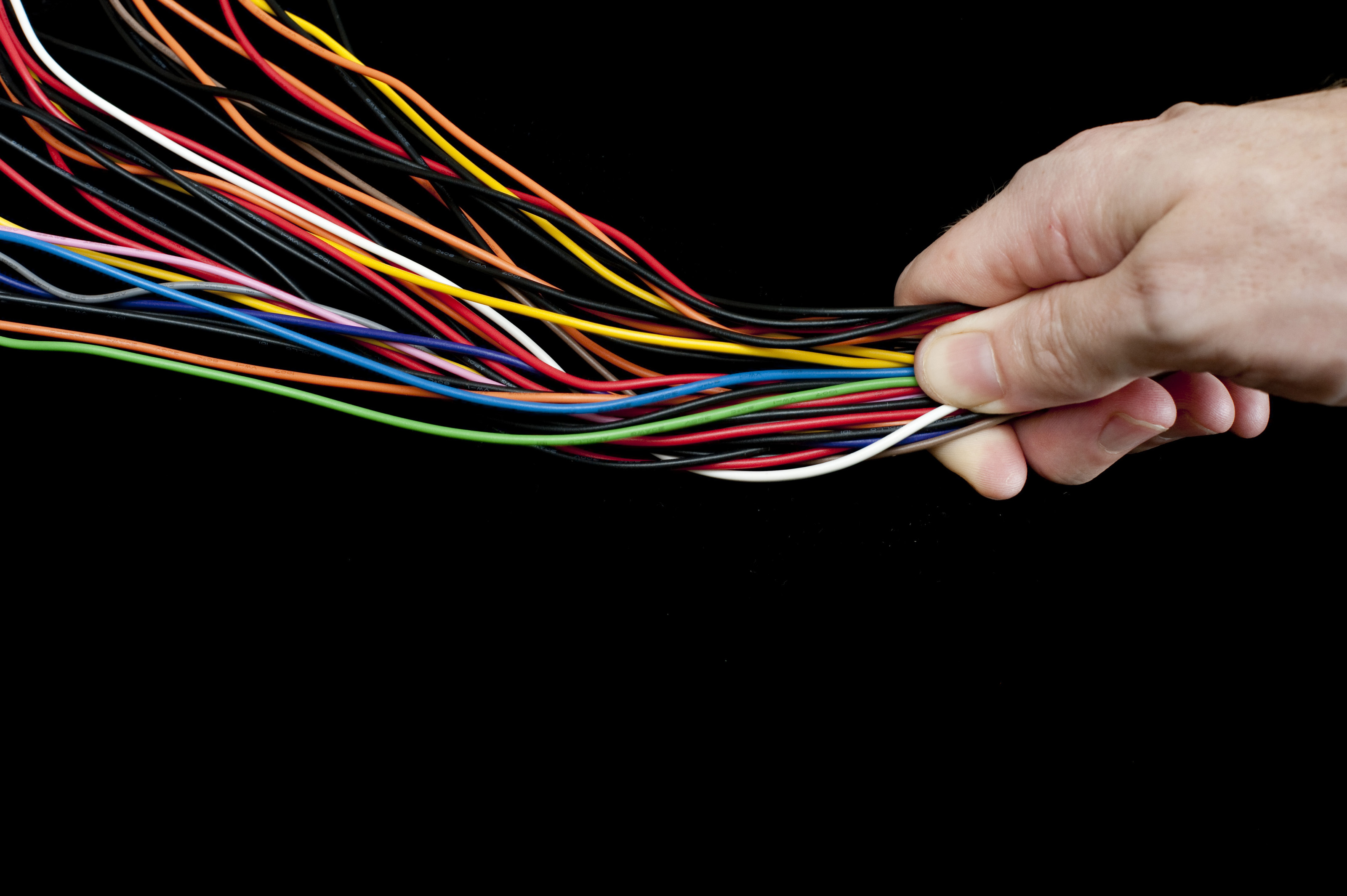 Multiple multicoloured electric wires in a diverging tangle are constrained and controlled under the thumb of a man