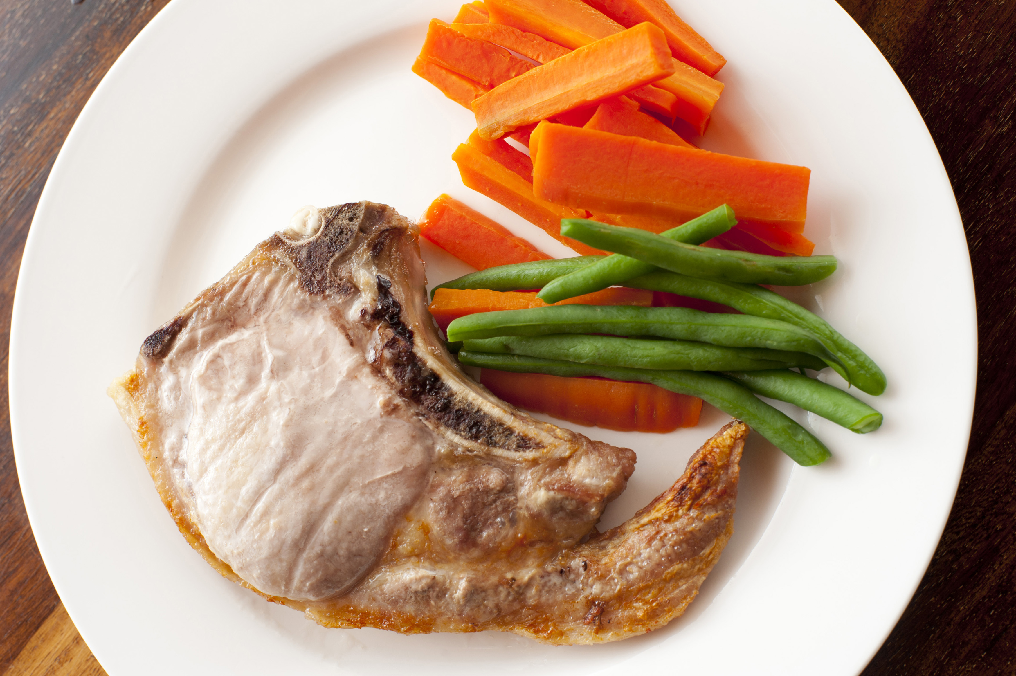 Keywords: pork chop, pork cuttlet, pork, bone, butcher, butchery, carrot, cooking, fresh, from above, green beans, grilled, meat, plate, tasty, vegetables