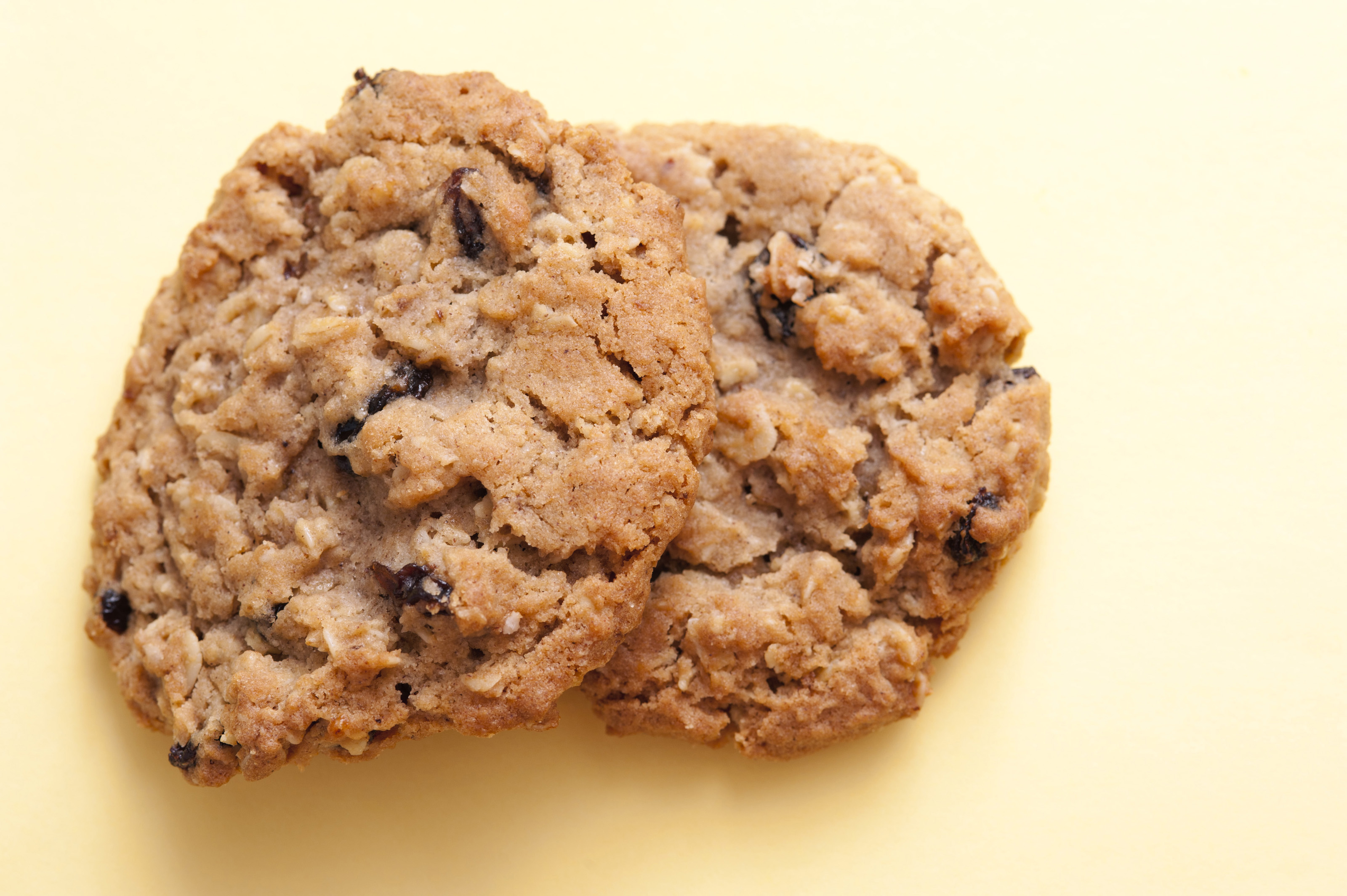 Cookie treat with two delicious crunchy oat cookies or biscuits with raisins on a yellow background with copyspace