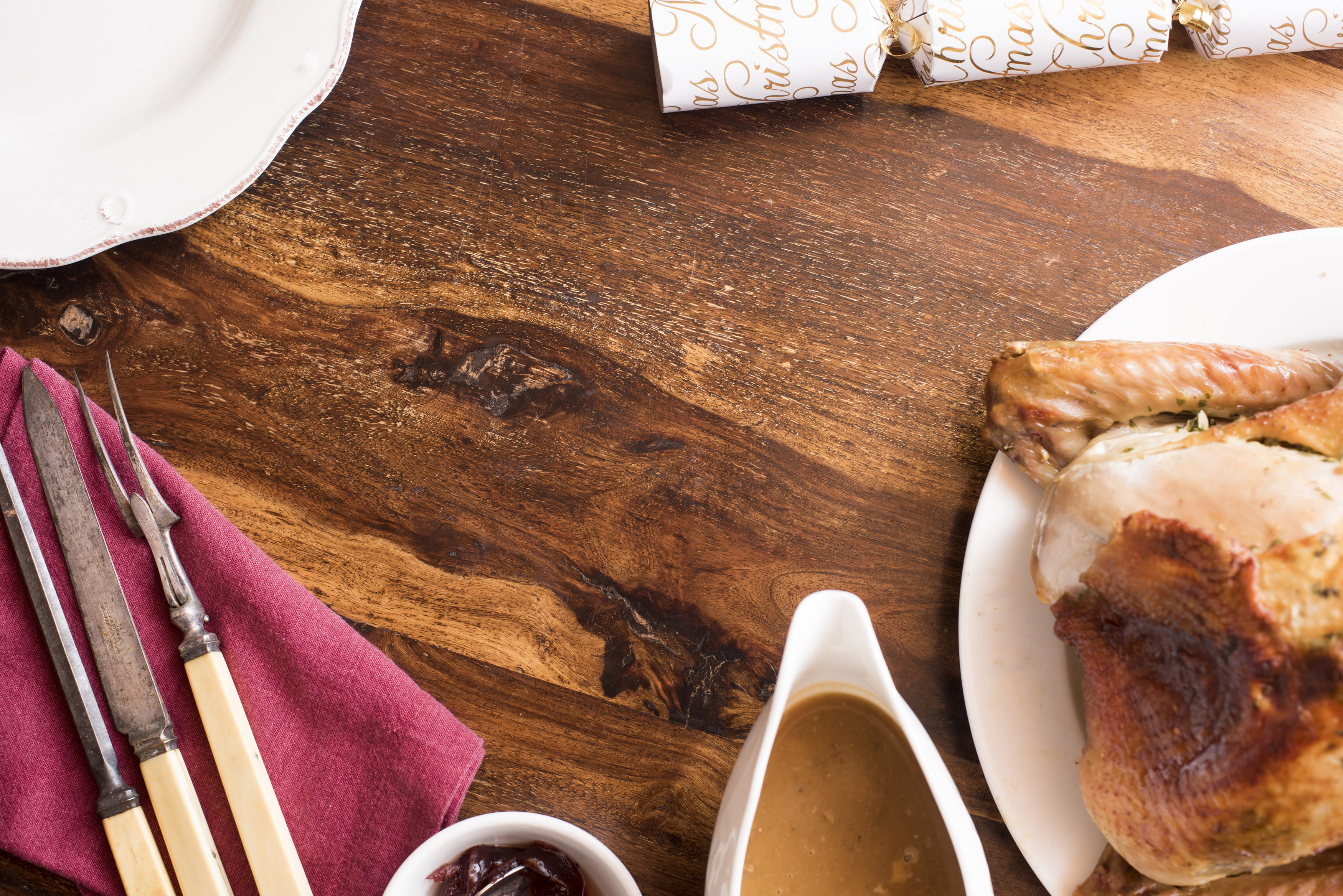 Keywords: christmas, copy space, cracker, decoration, dinner, meat, roast, table, turkey, utensils, wooden, gravy, holiday, xmas, invitation