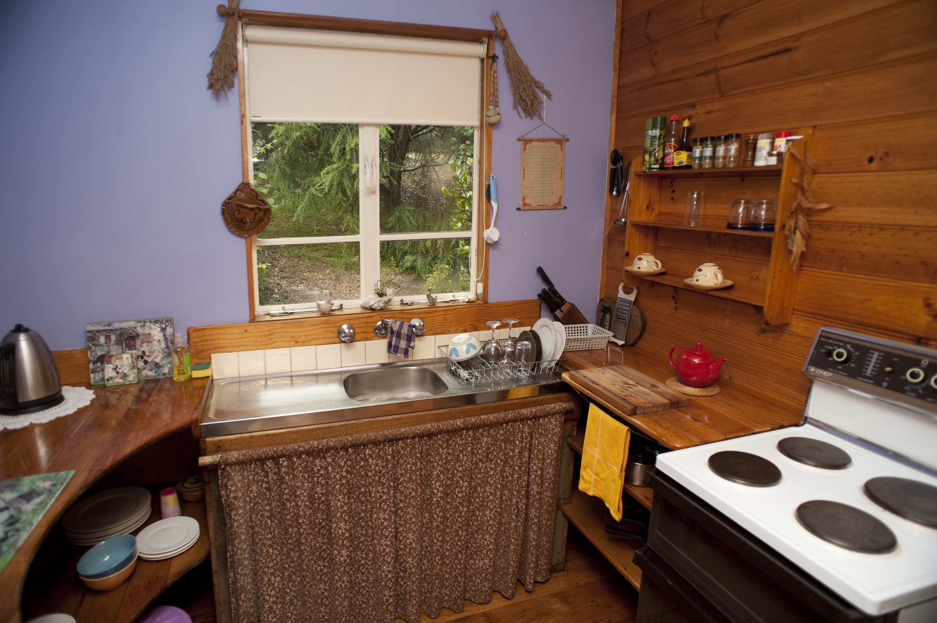Rustic cottage kitchen with simple wooden fixtures and fittings, a stove and a sink positioned under a window with a view onto greenery