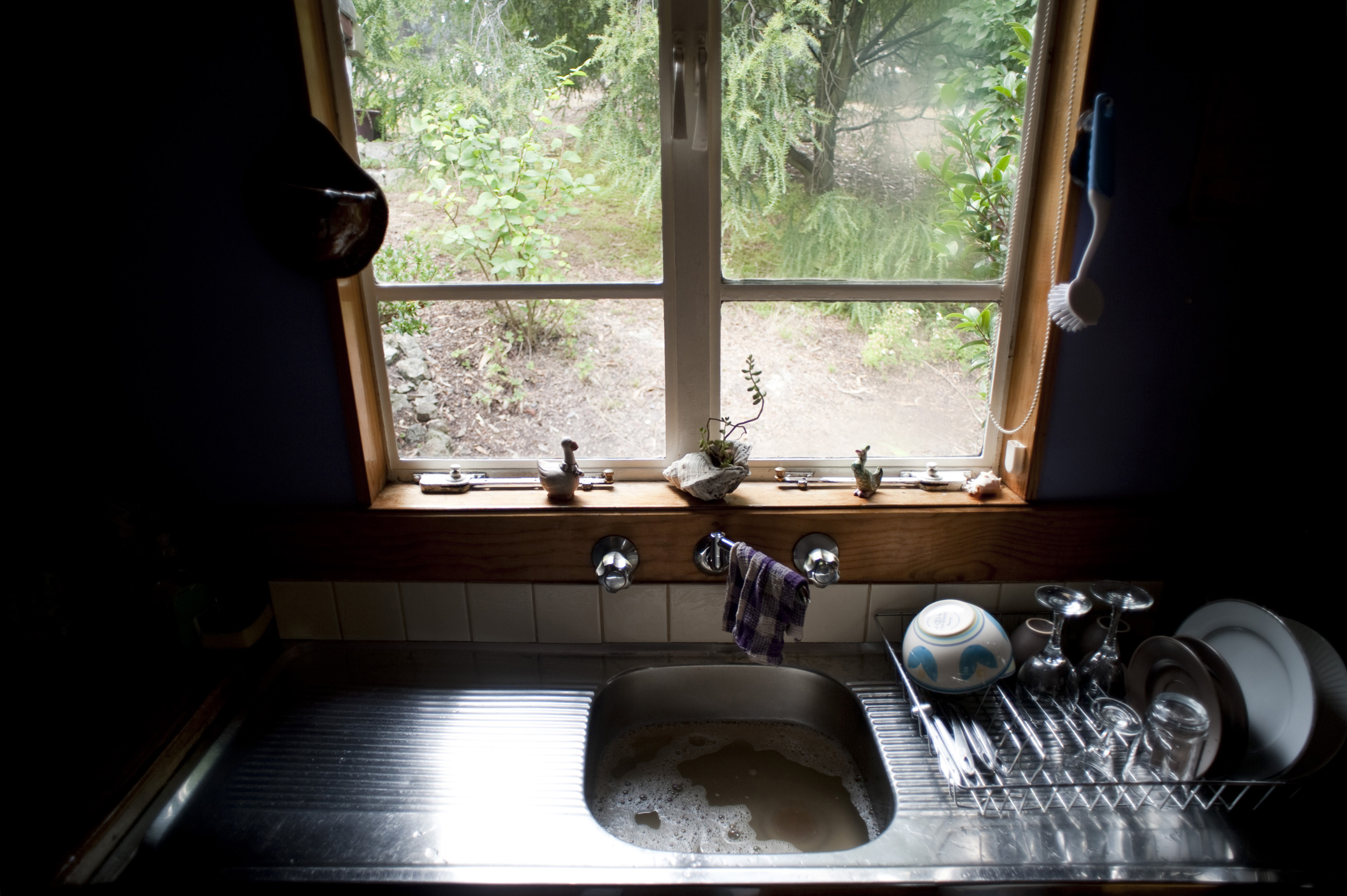 Keywords: country, rustic, cottage, garden, decor, window, view, dark, hygiene, interior, simple, kitchen, cleanliness, plumbing, sink, taps, stainless steel, dishes, draining, washing up