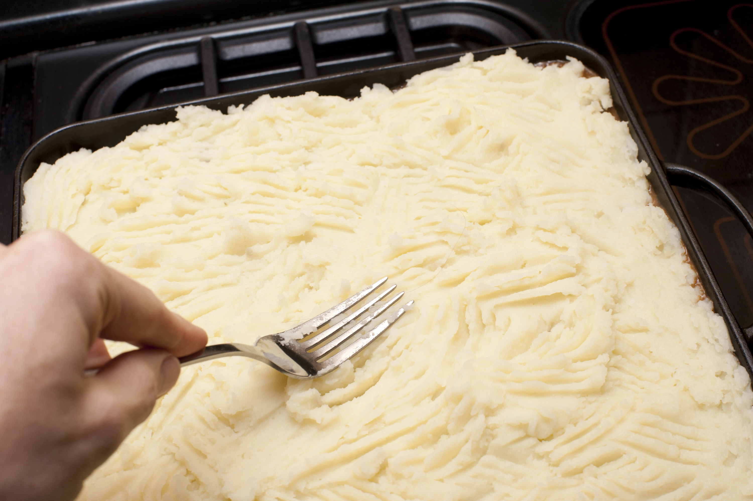 Preparing a cottage pie for dinner as a man uses a fork to press the mashed potato crust into position before placing it in the oven to grill or bake