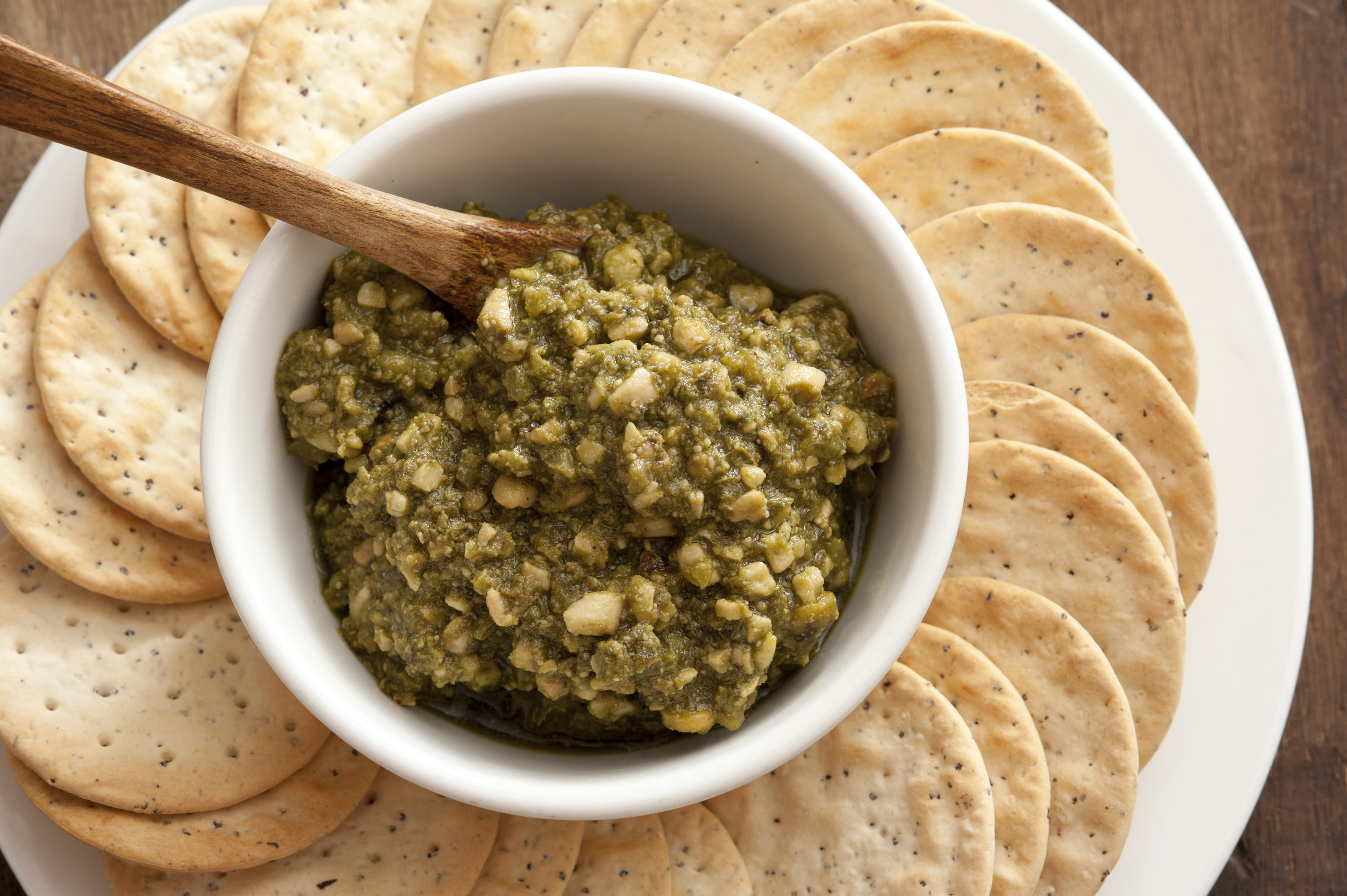 Keywords: appetizer, bowl, buffet, crackers, dip, finger food, overhead, pesto, plate, savory, serving, snack, water biscuits, basil, italian, rustic