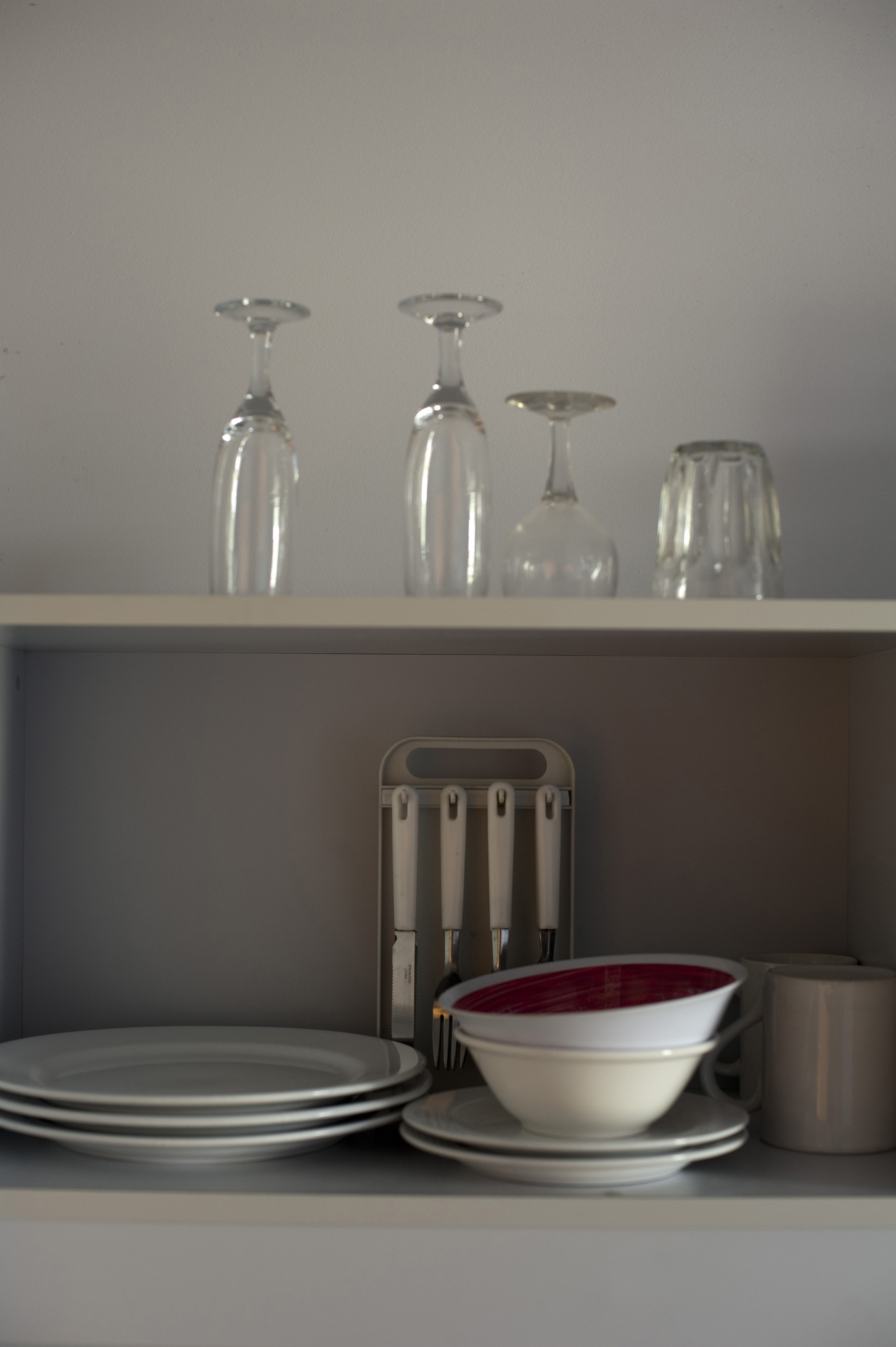 Keywords: open, clean, neat, kitchen, stacked, glasses, storage, wineglass, ceramic, tumbler, crockery, glassware, cutlery, mugs, bowls, dishes, shelves, organisation, dinnerware, shelving