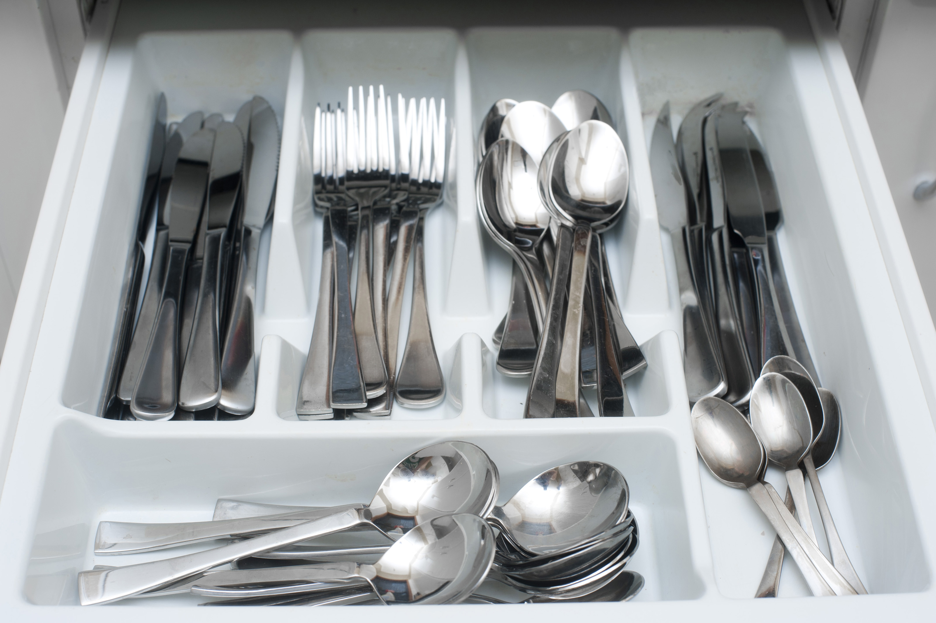 Keywords: kitchen, cutlery, utensils, fork, knife, spoon, drawer, white, clean, new, modern, concept, shiny, silver, reflection