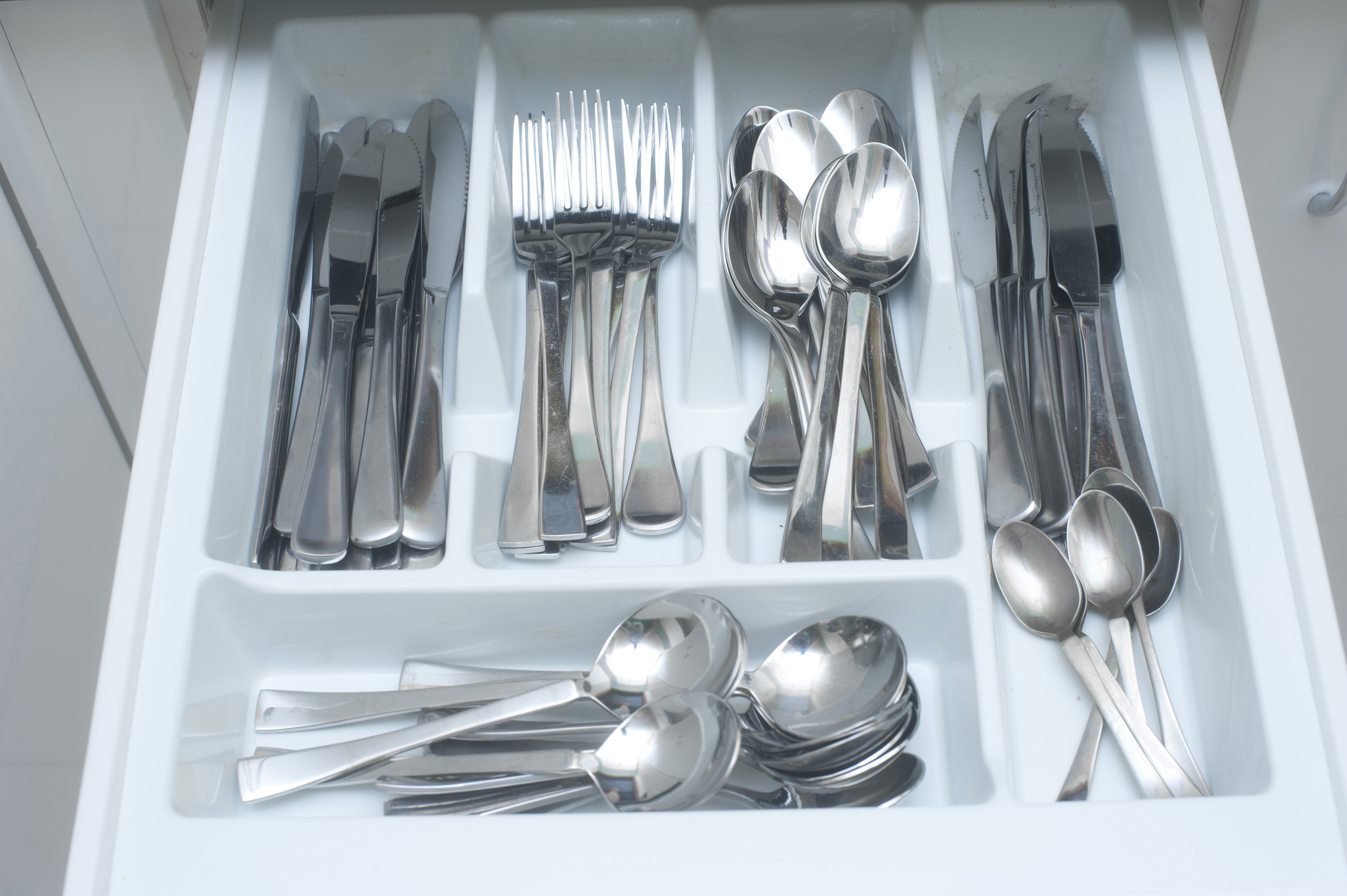 Keywords: kitchen, cutlery, utensils, fork, knife, spoon, drawer, white, clean, new, modern, eating, concept, diet, home, domestic, household