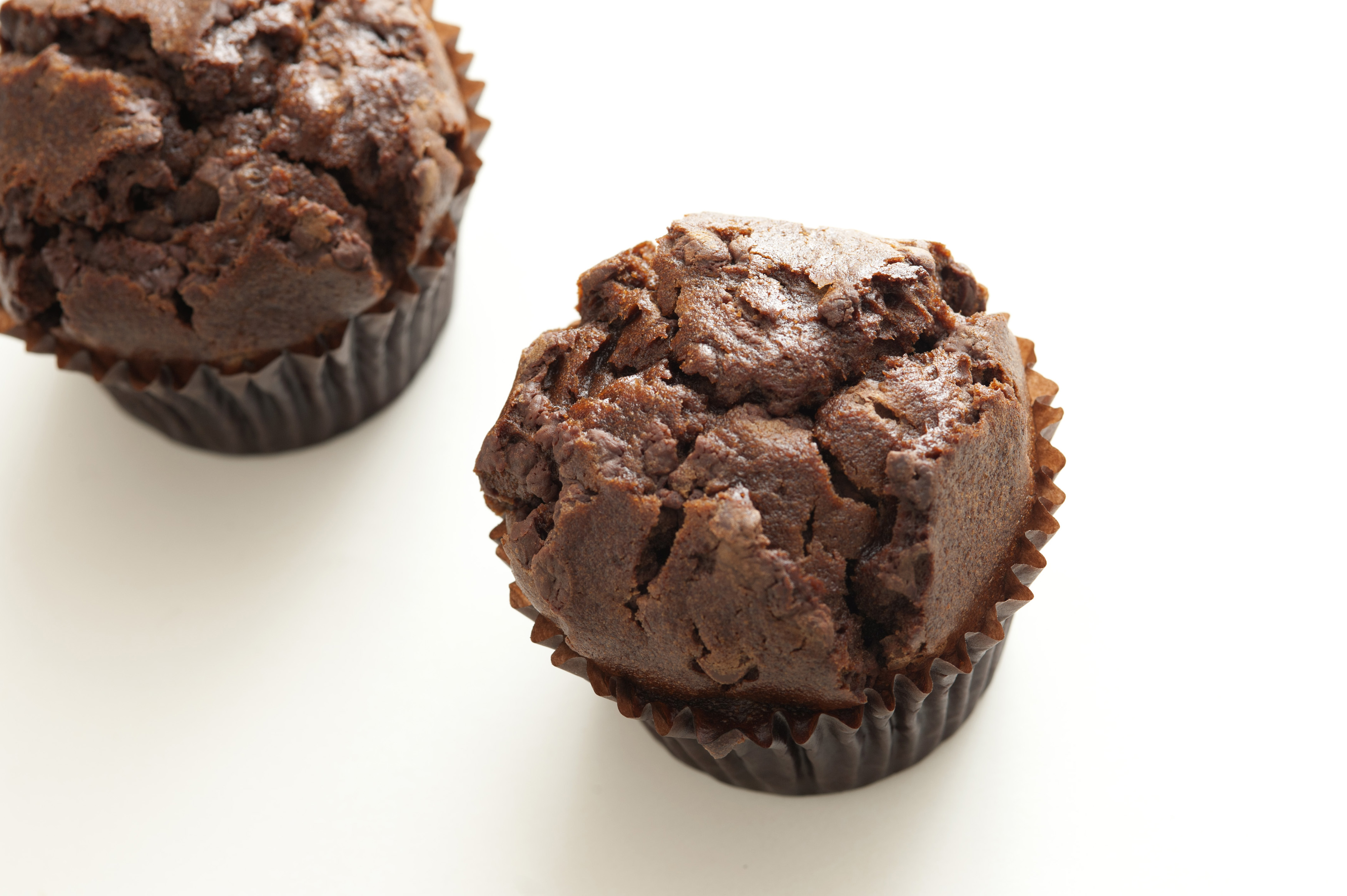 Keywords: above, chocolate, copy space, muffin, pair, sweet, treat, two, white background, baked, snack, dessert, isolated, food, homemade