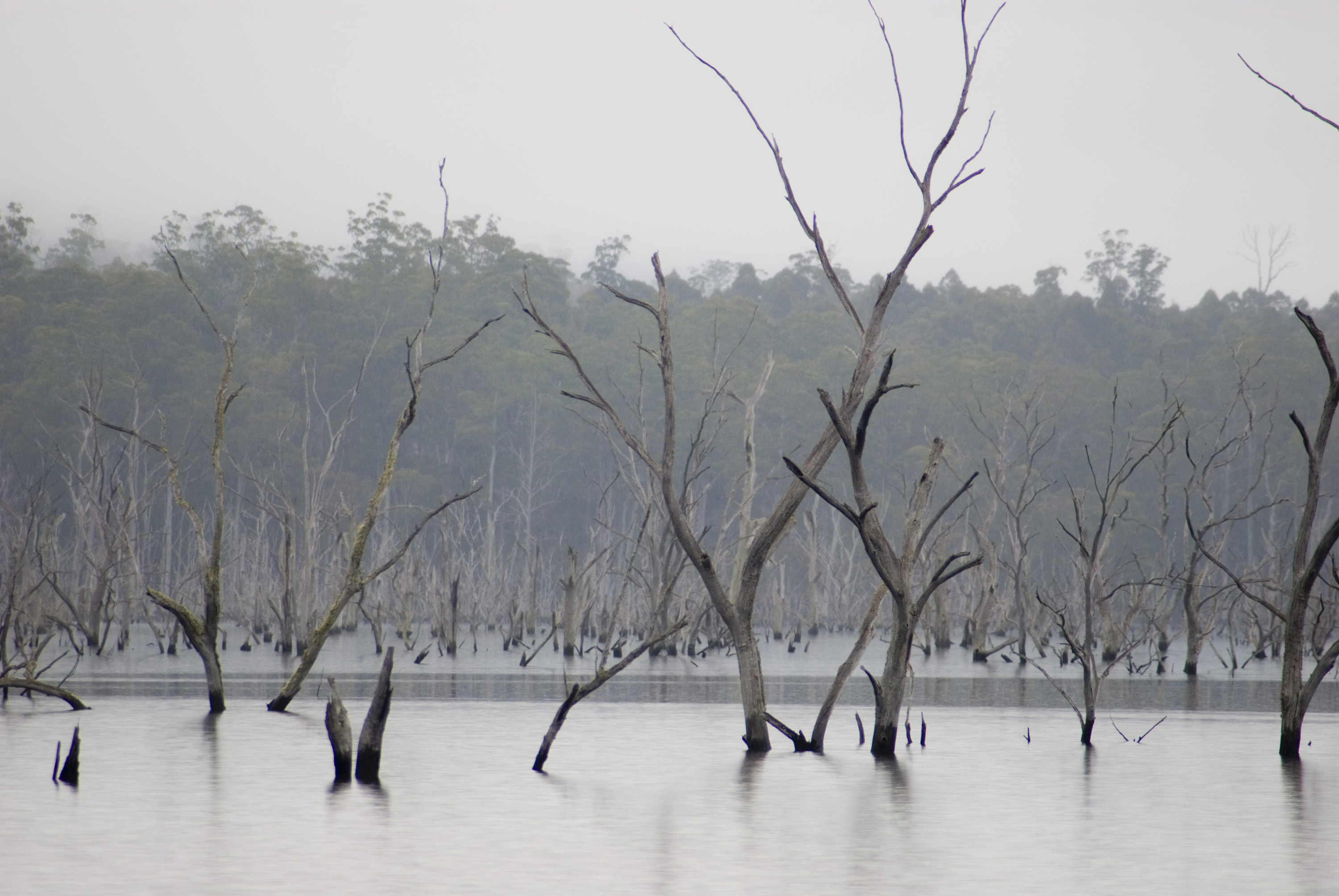 Keywords: tasmania, australia, nature, trees, environment, water, dead, bare, misty, lifeless, dam, desolate, submerged, drowned, hydroelectric scheme