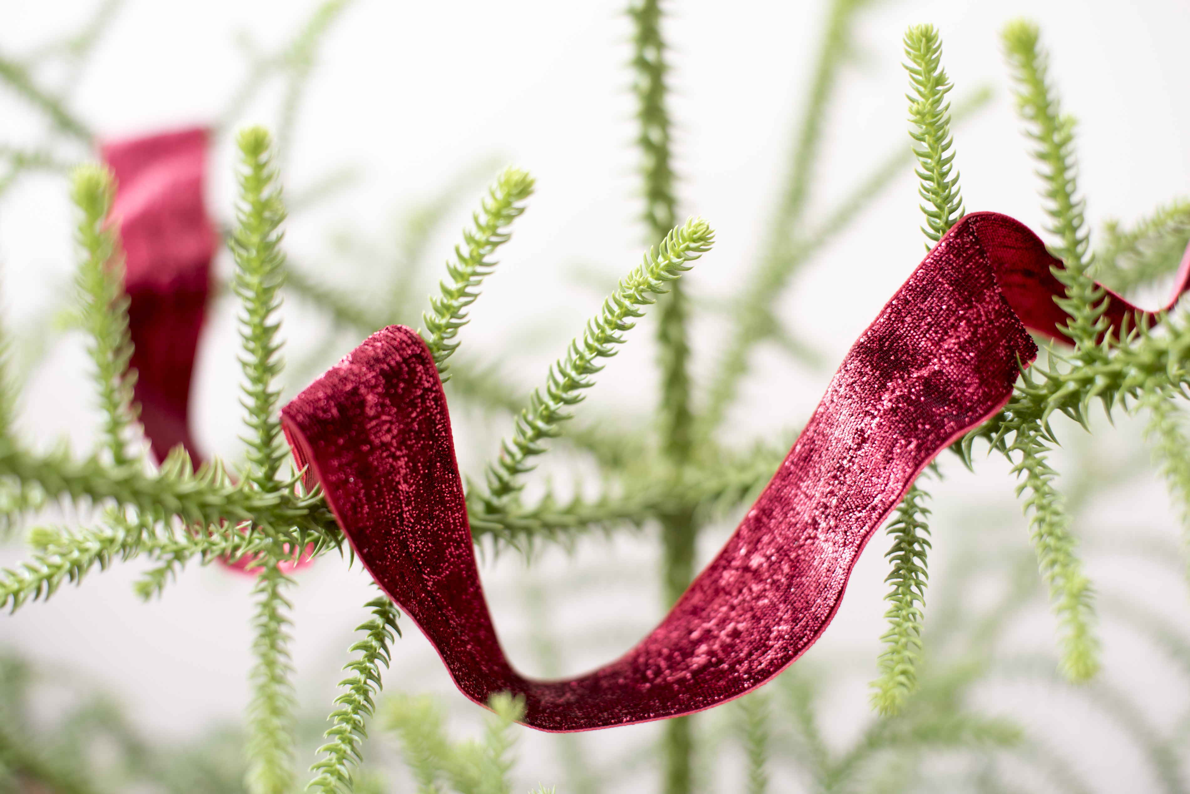 Keywords: christmas, holiday, xmas, decorated, tree, branch, festooned, pine, red, decoration, ribbon, garland, closeup, minimalism, textile