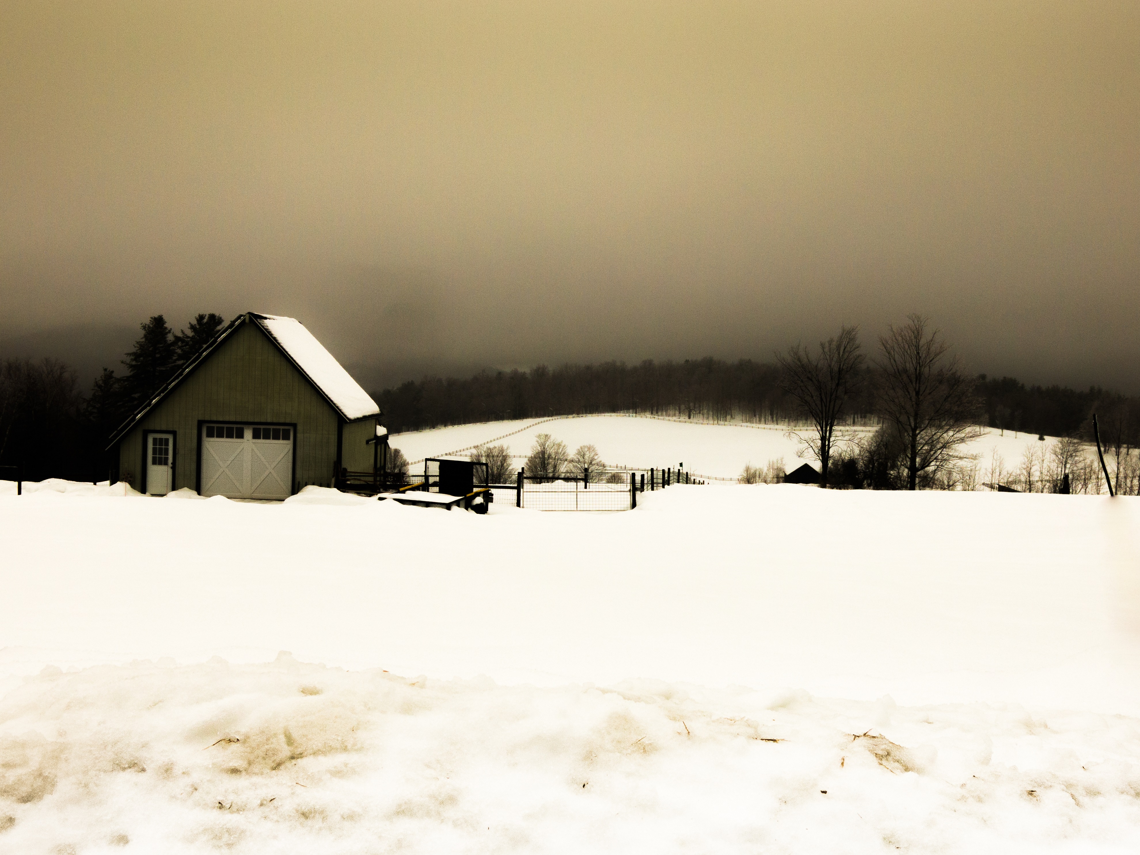 Barn in the snow after the rain, in winter in rural vermont. Sepia.