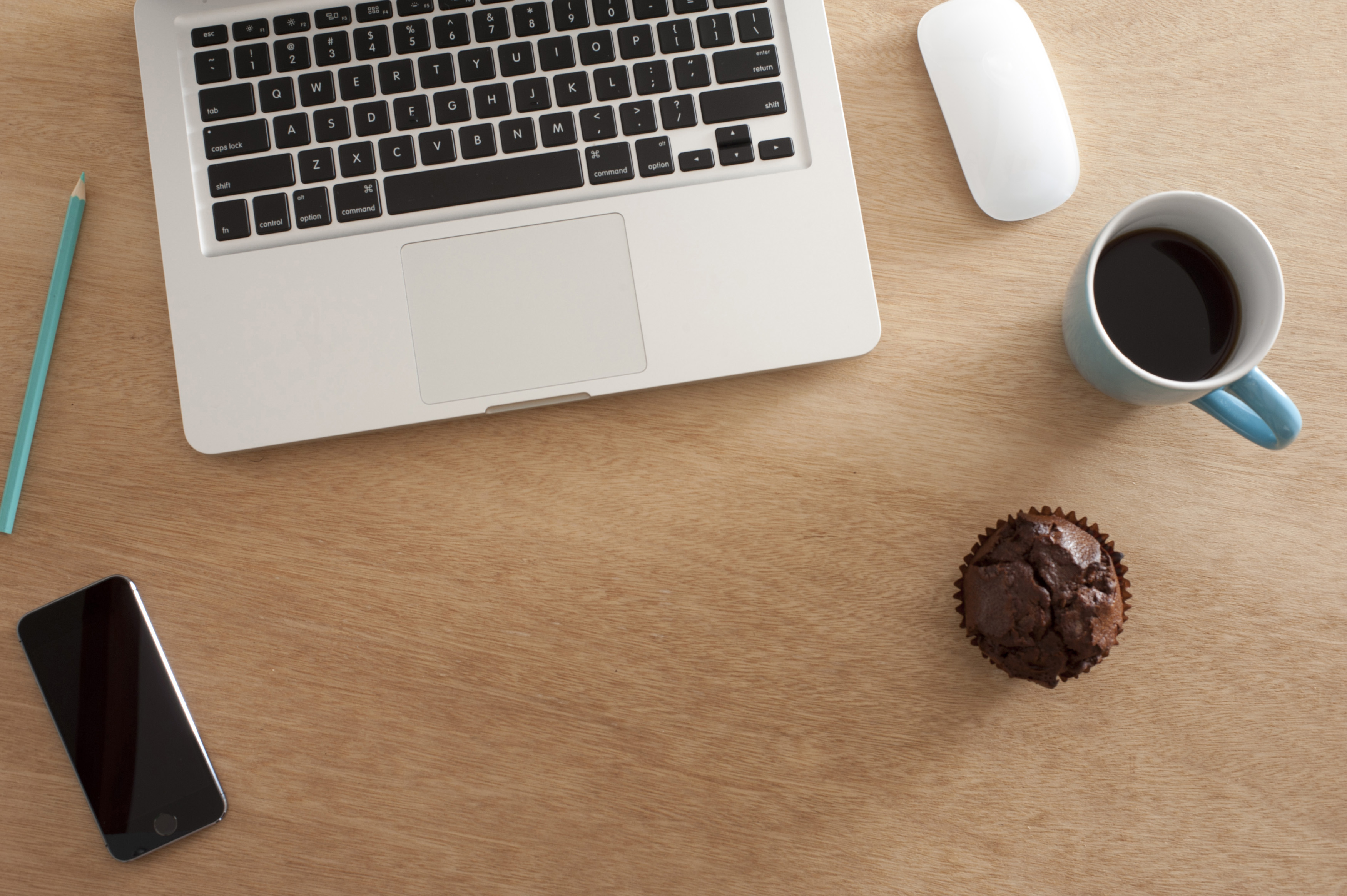 Keywords: computer, desk, mobile, office, overhead, coffee, copy space, laptop, muffin, objects