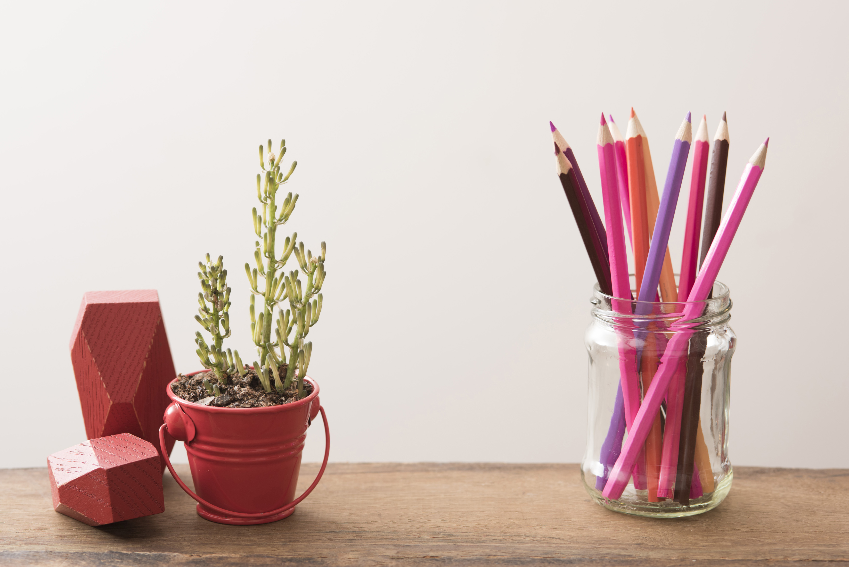Keywords: bucket, colored pencil, desk, ornaments, plant, potted, still life, blank, glass, jar