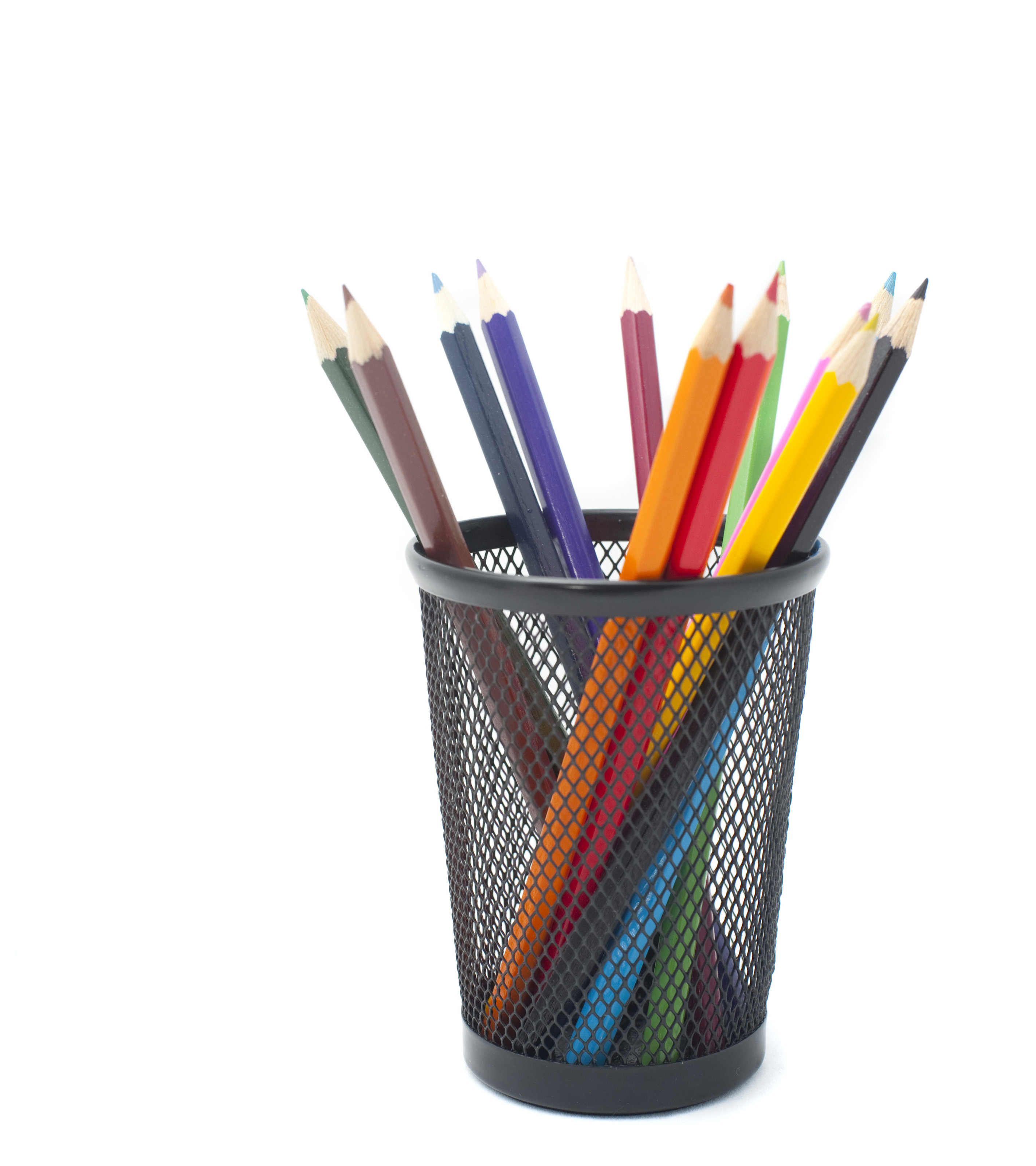 Desk tidy with filled with sharpened wooden coloured pencils on a white background