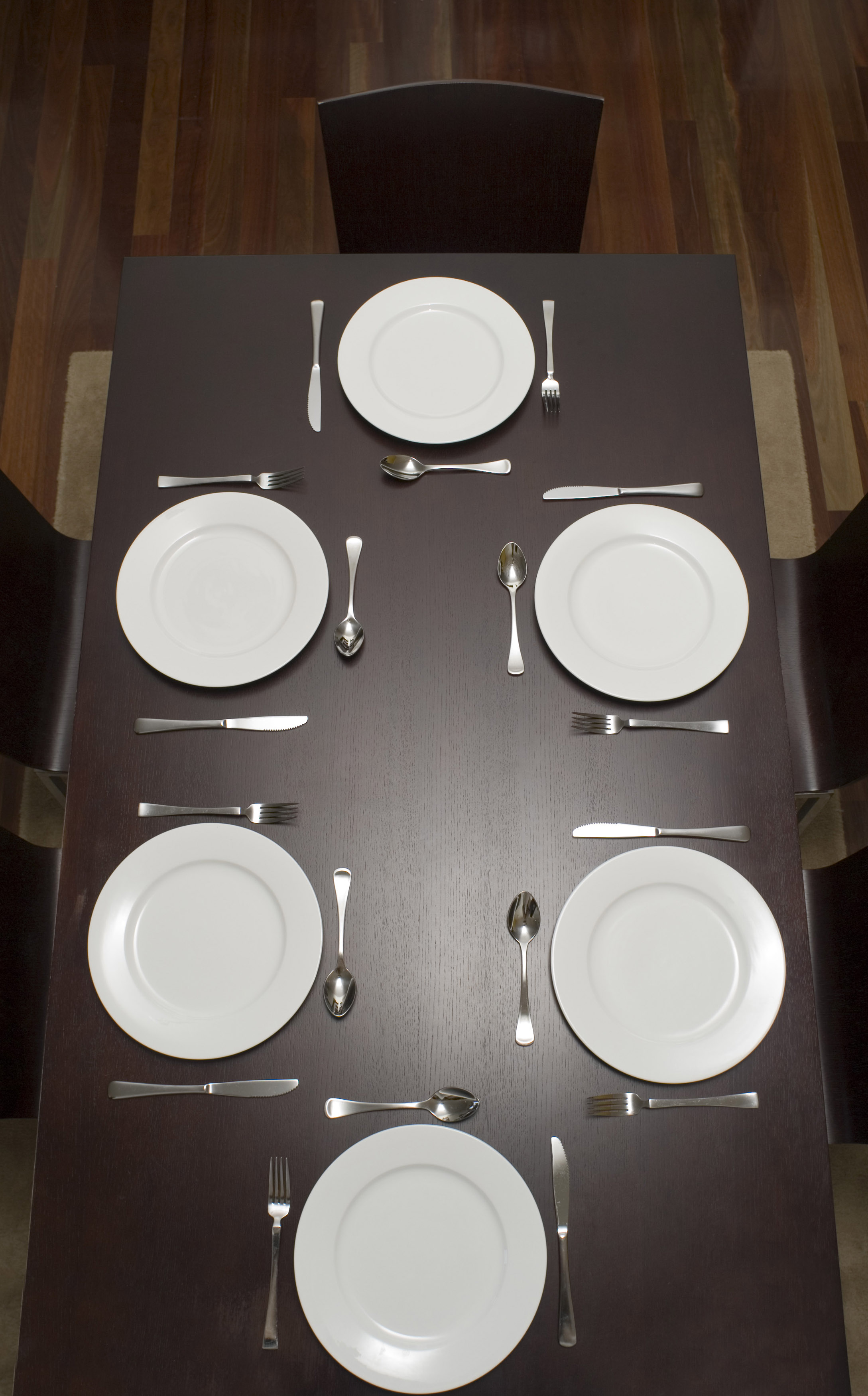 Dark wood dining table laid with clean empty white plates and cutlery for six but no food viewed from above