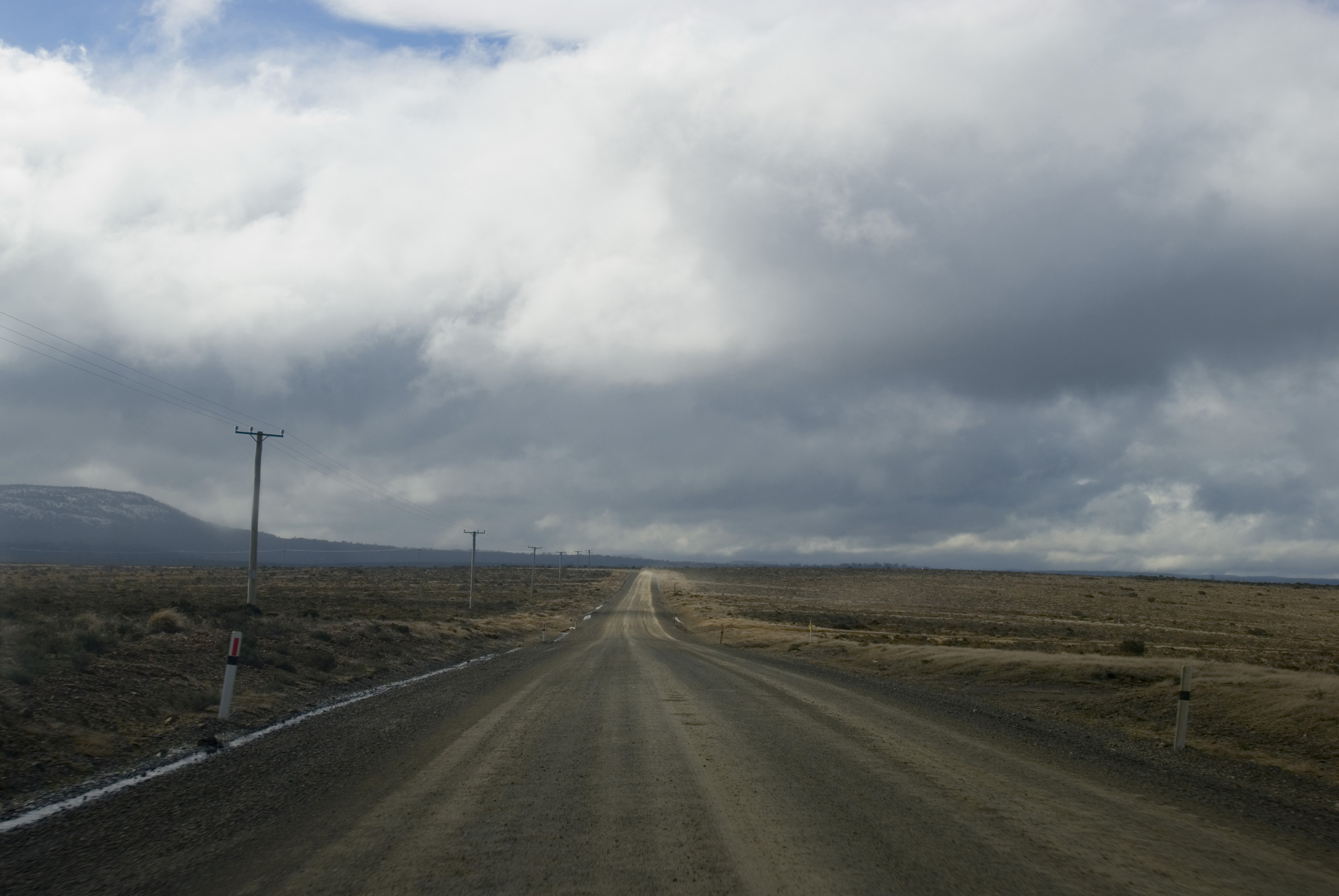 Keywords: travel, sky, countryside, rural, transport, long, road, straight, gravel, dirt, cloudy, australia, tasmania, receding, diminshing