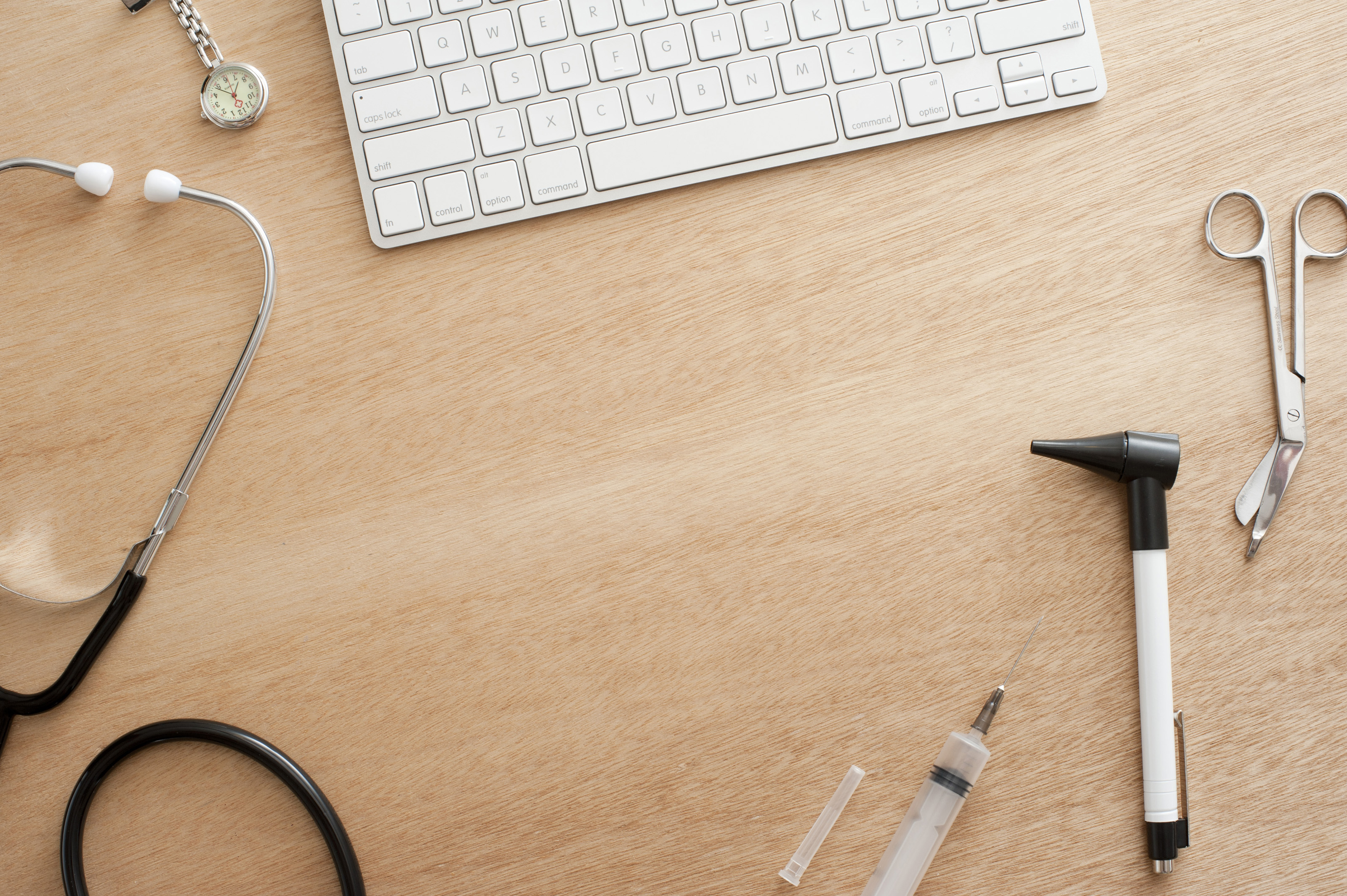 Keywords: background, computer, hero, copy space, desk, doctor, keyboard, medical, medicine, scattered, scissors, stethoscope, concept, tools, instruments, office