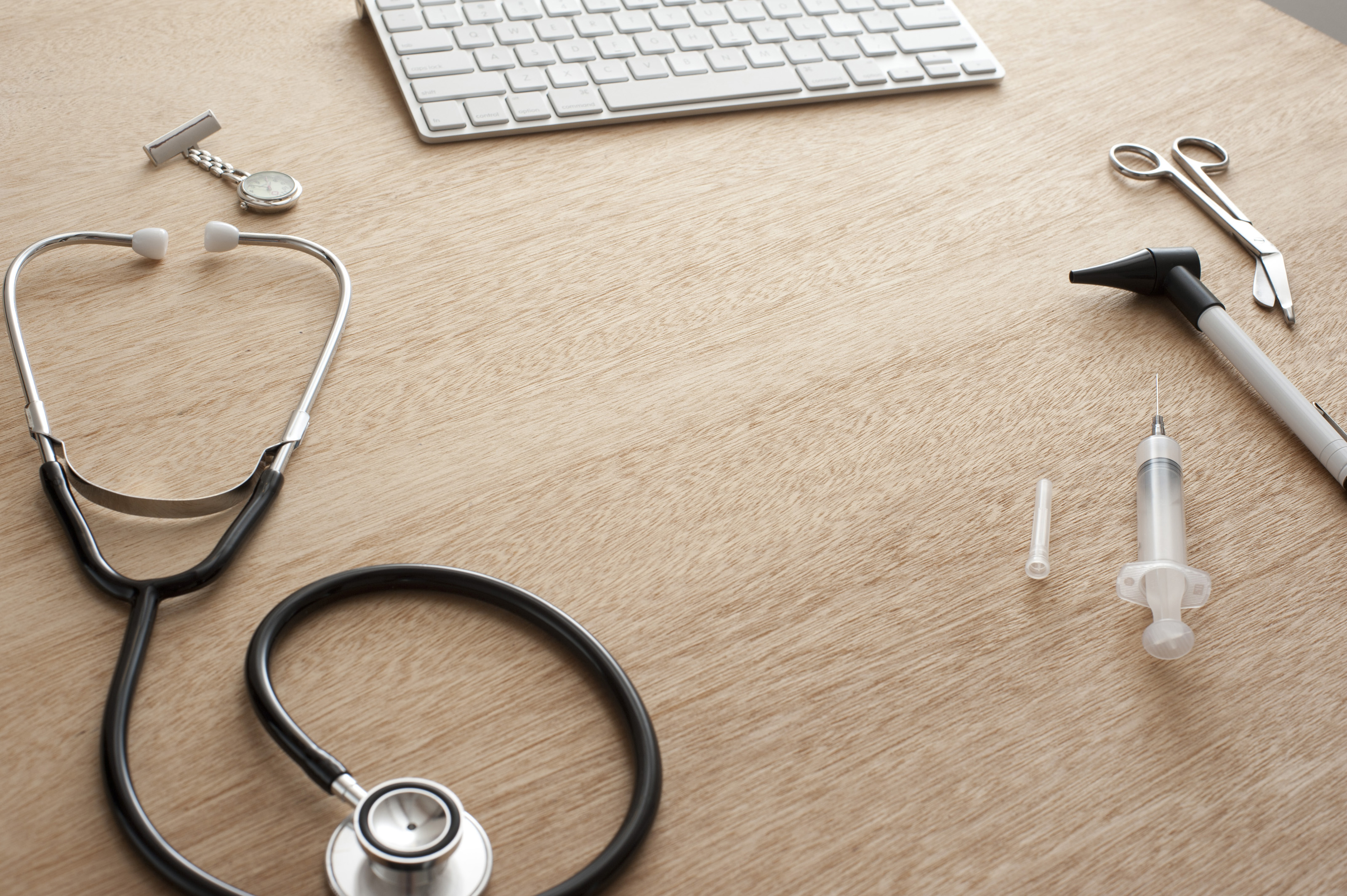 Keywords: medical, above, copy space, desk, computer, keyboard, stethoscope, supplies, tools, wooden, technology, scissors, syringe, healthcare, access