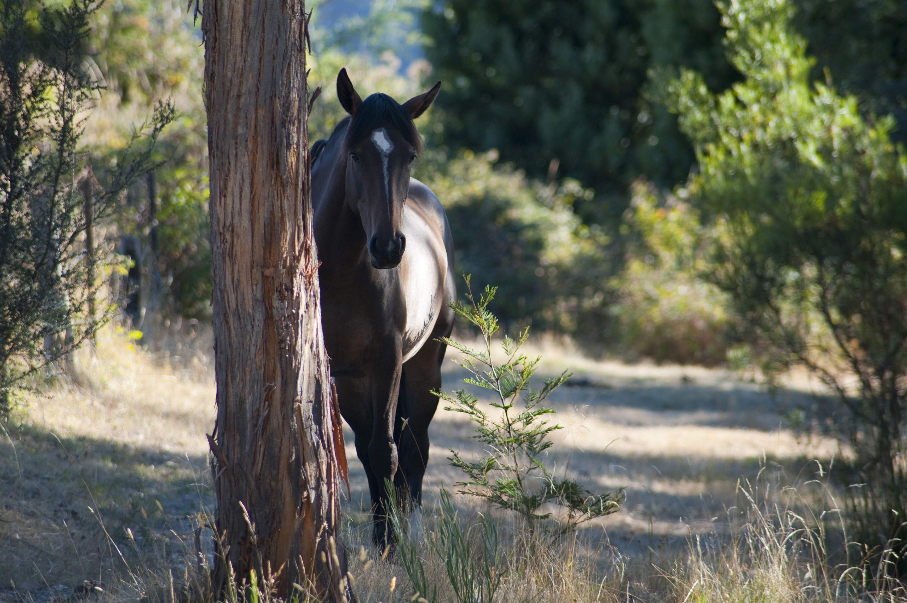 Keywords: brown, woodland, tree, trunk, behind, animal, pet, domesticated, mammal, horse, mare, equestrian, equine, equus, grazer