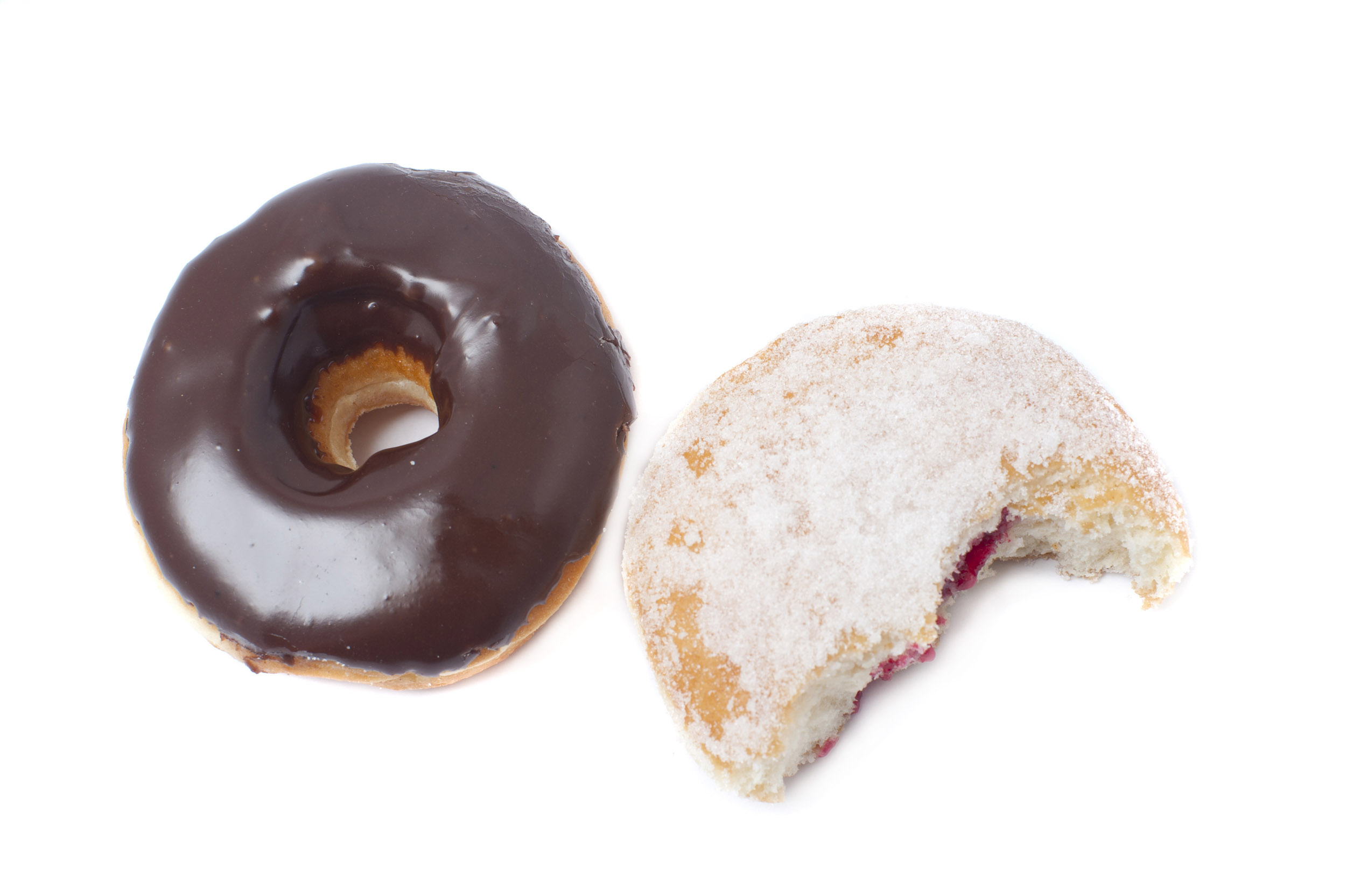 Freshly baked fried chocolate and jam doughnuts on a white background with the jam doughnut broken open to show the filling