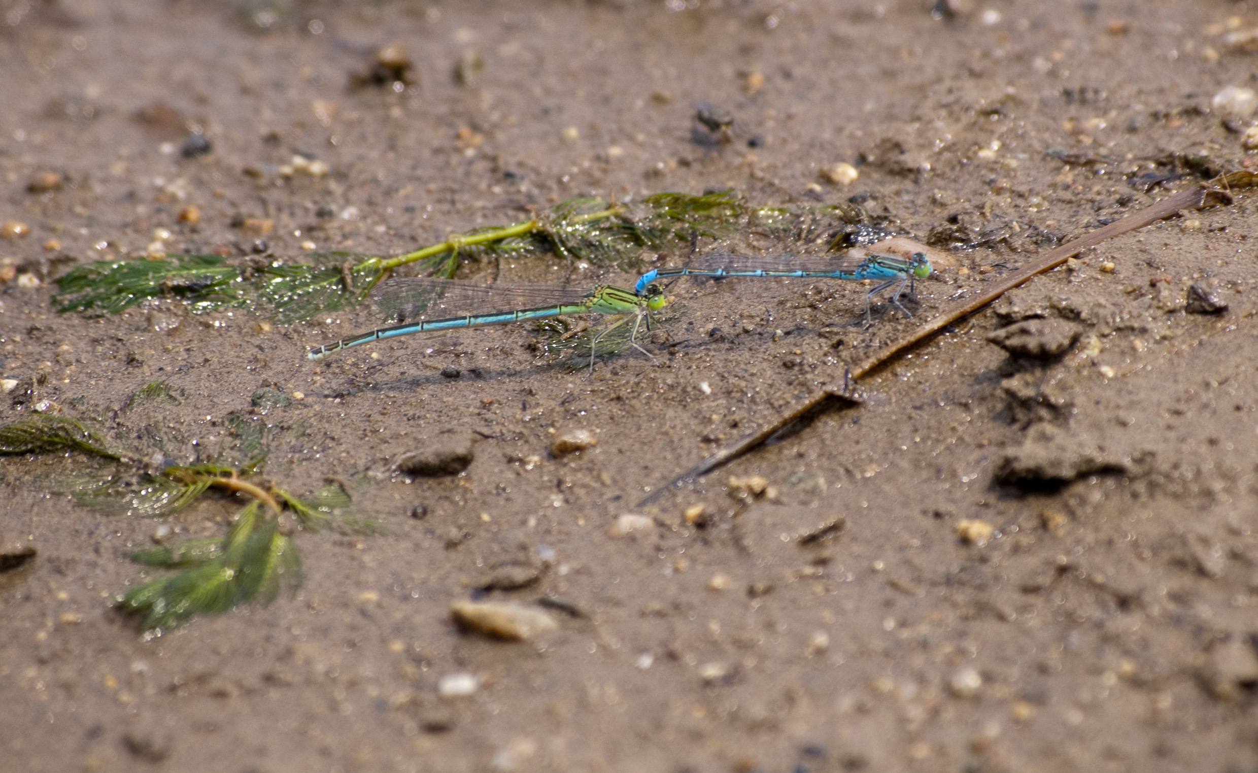 a pair of vivid blue and green coloured dragonflies