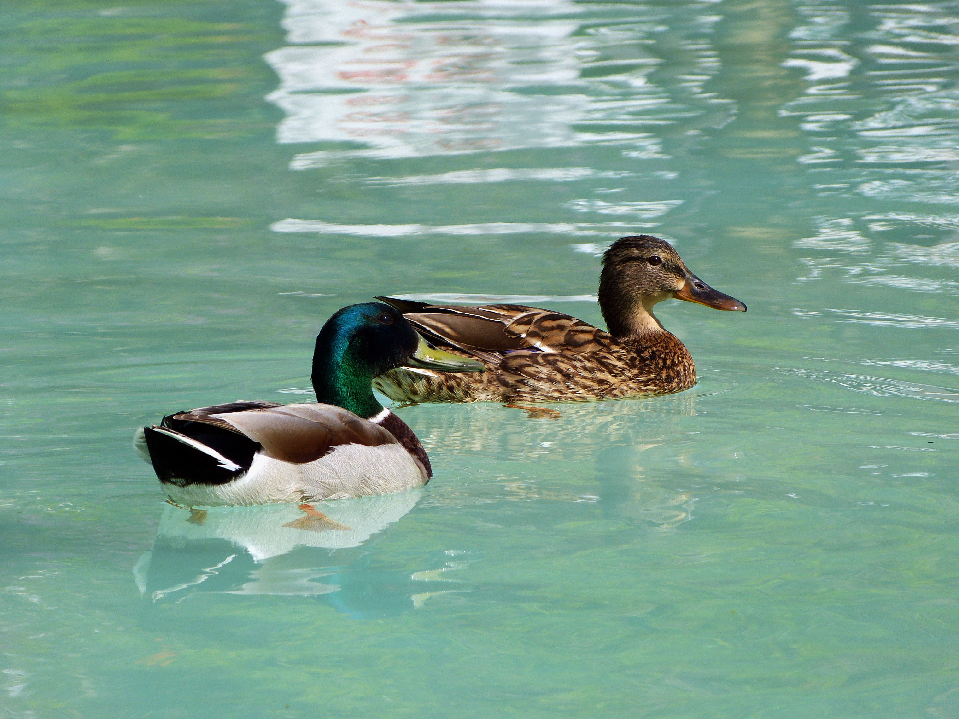 Keywords: Ducks, birds, pond, water, lake, parc, swim, colours, reflection, sun, spring, calm, tranquil, beautiful, wildlife, couple, relation, close up, green, turqoise