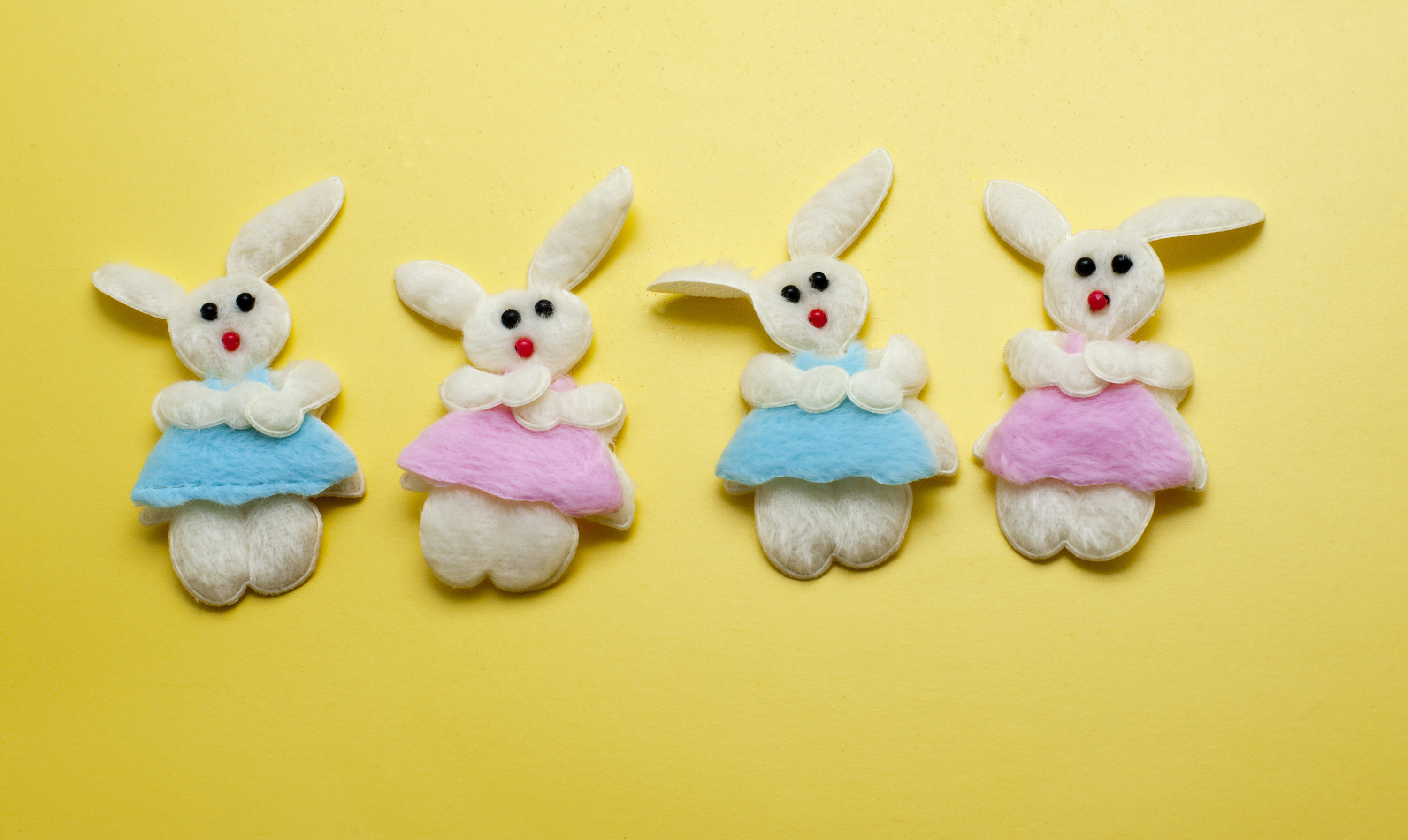 Four decorative needlework Easter Bunnies of soft felt wearing pink and blue garments on a yellow background