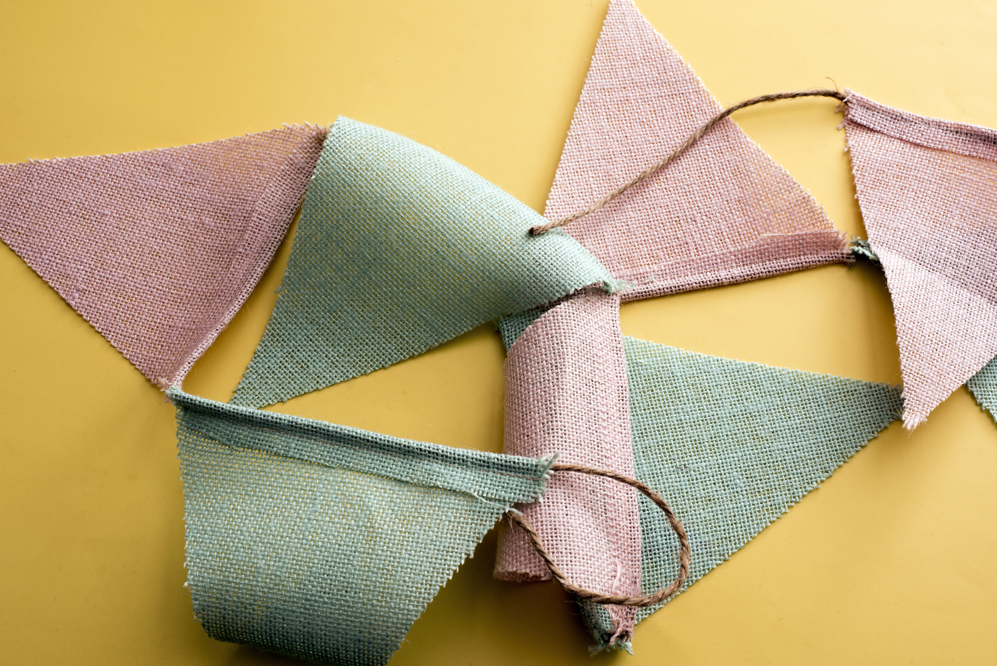 Close-up view of fabric triangle flag garland laying on yellow surface background. Easter bunting concept