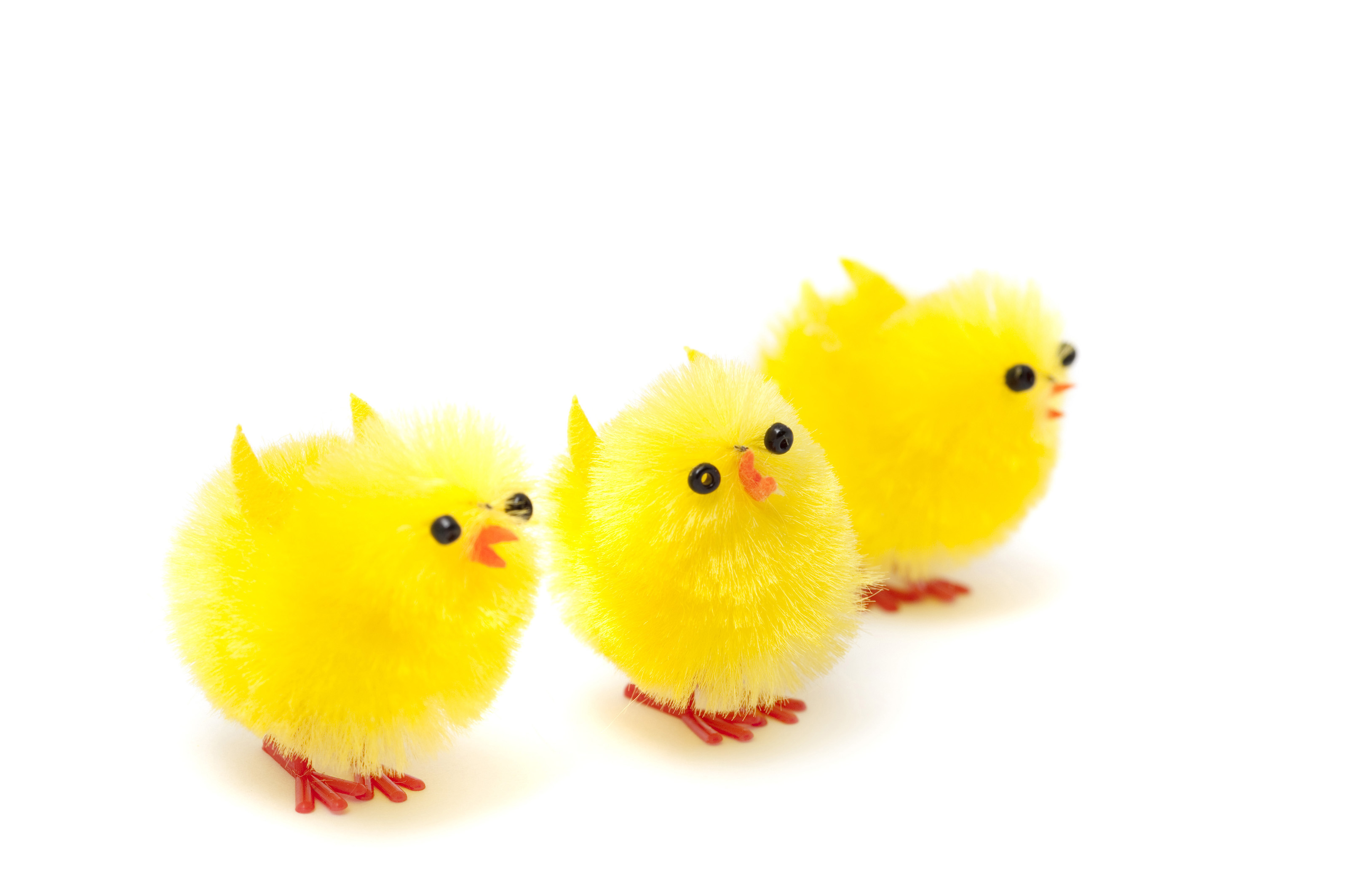 Three cute fluffy feathery yellow toy Easter Chicks with open beaks and raised wings on a white background