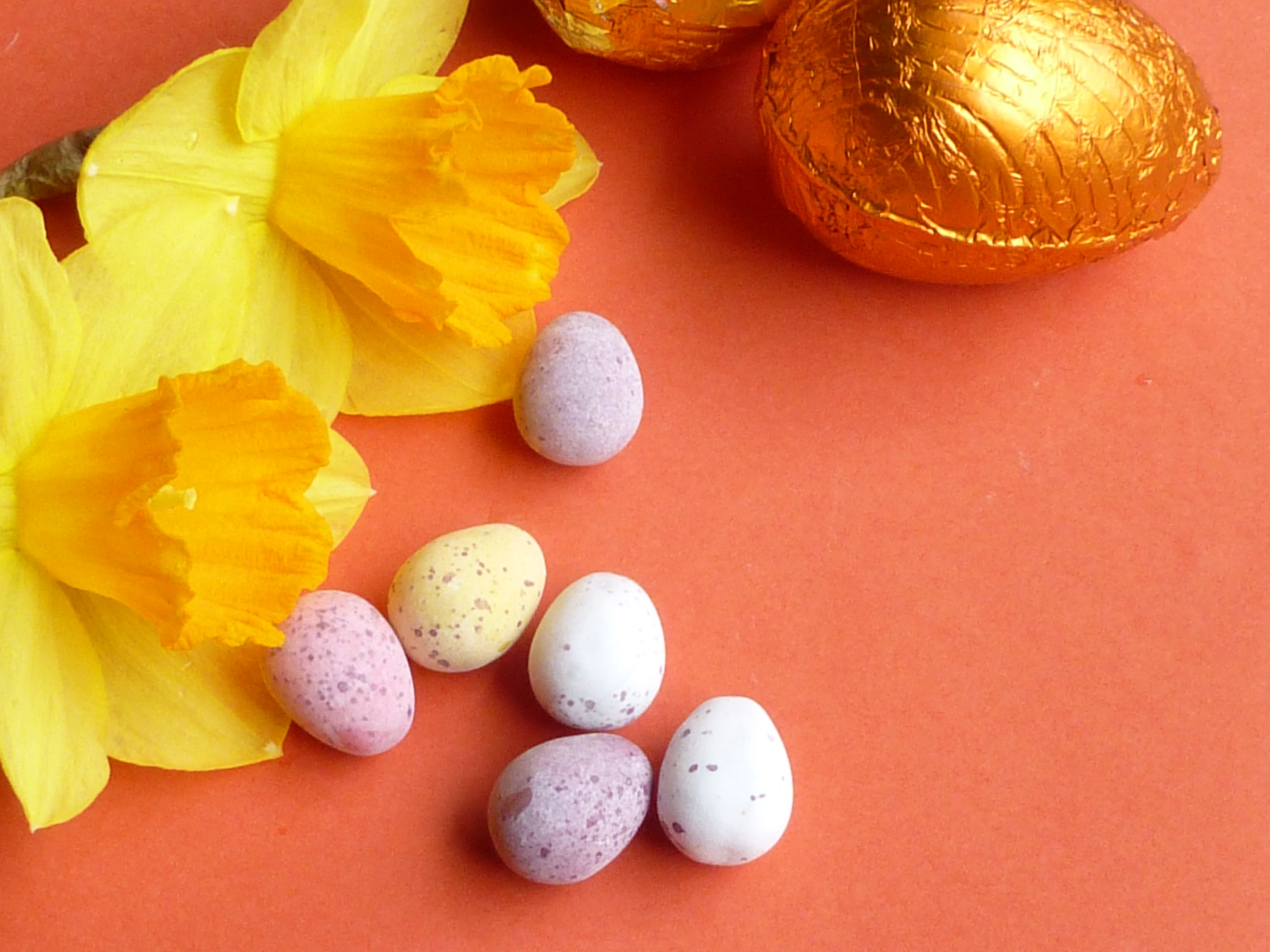 Mini sugar-coated Easter eggs with daffodils and a foil wrapped chocolate egg on an orange background with copy space for a holiday message