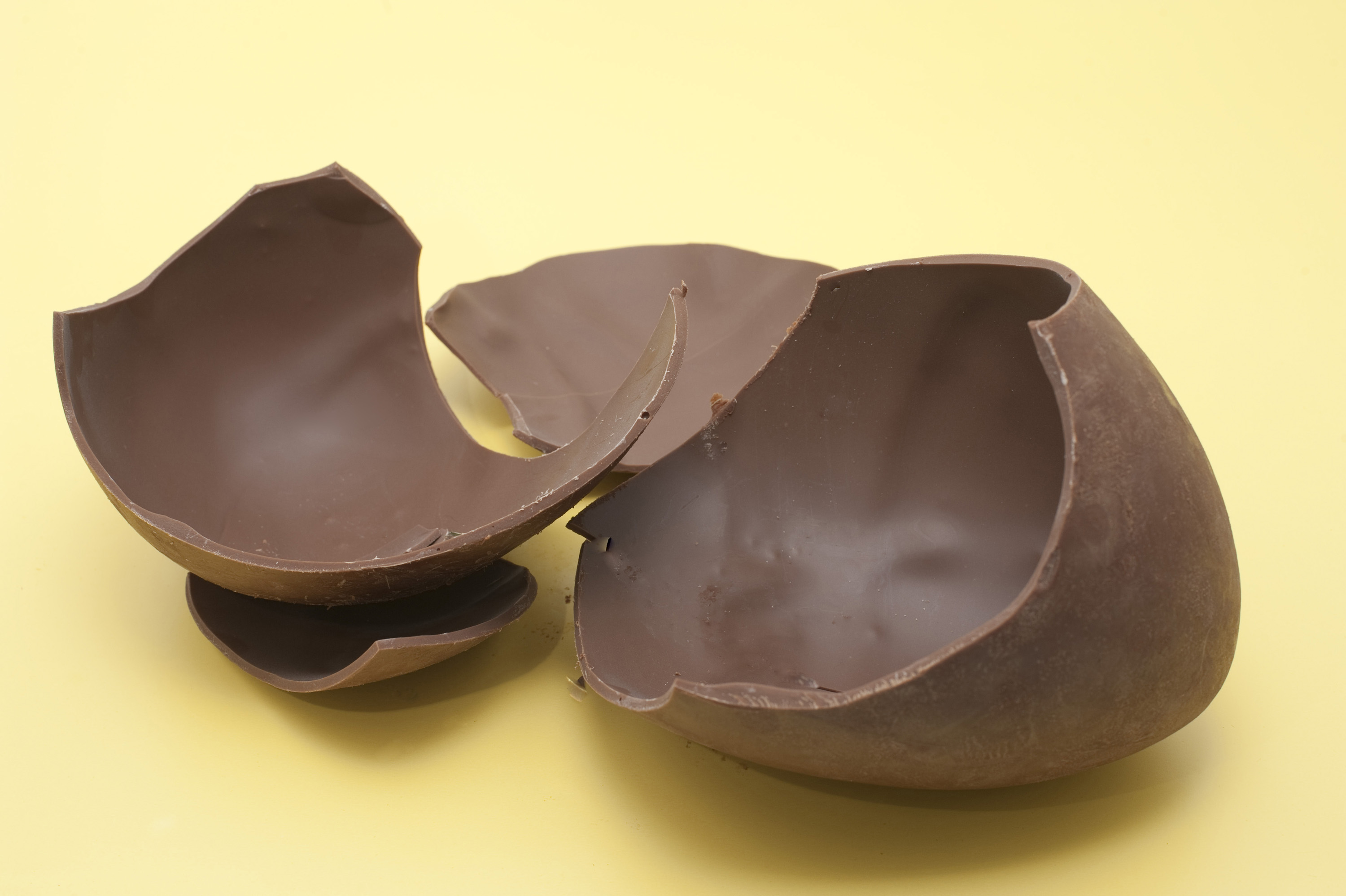 Pieces of a large broken chocolate Easter Egg on a yellow background