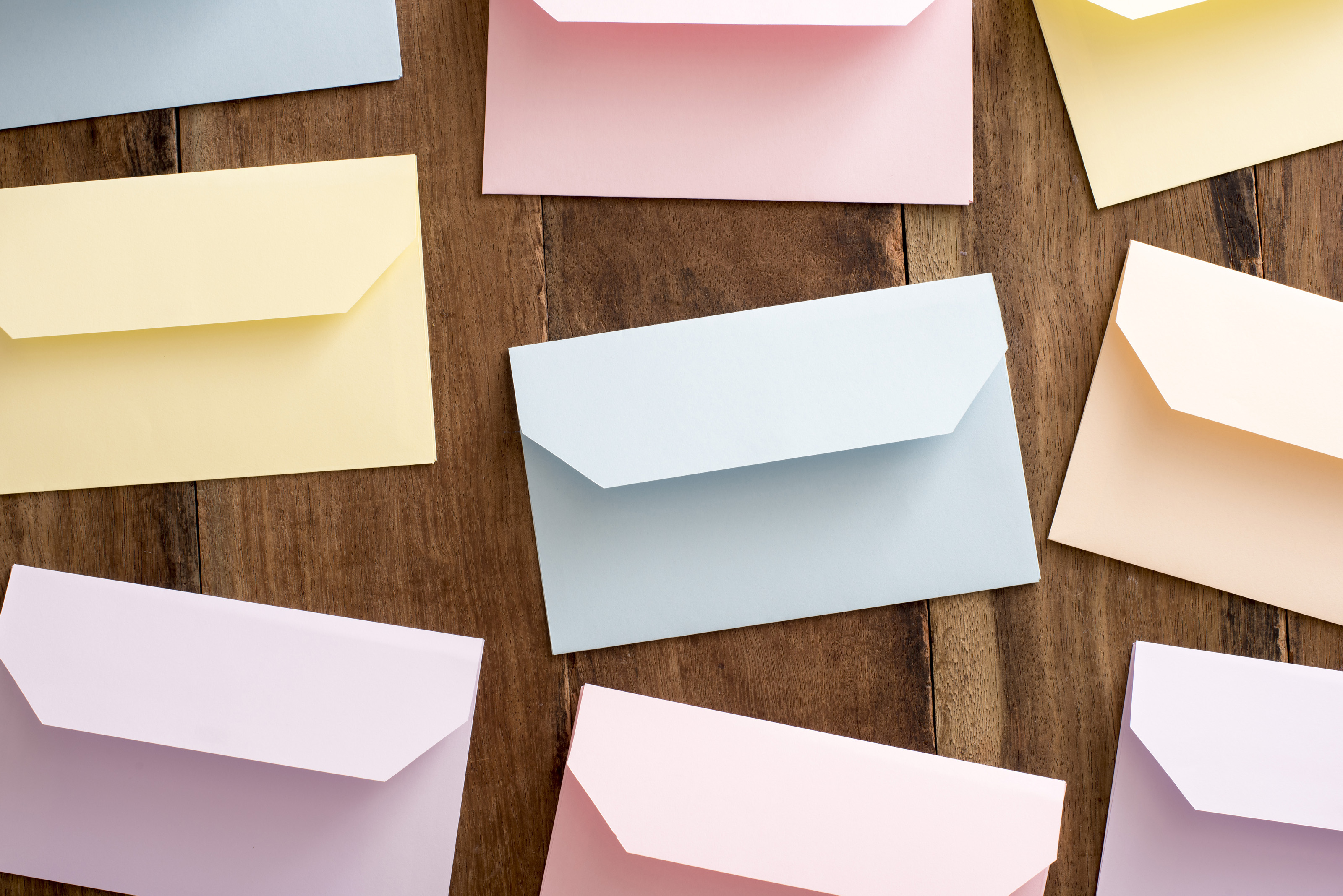 Still life of colored Easter envelopes lying face down with open flaps on a wooden background viewed from overhead