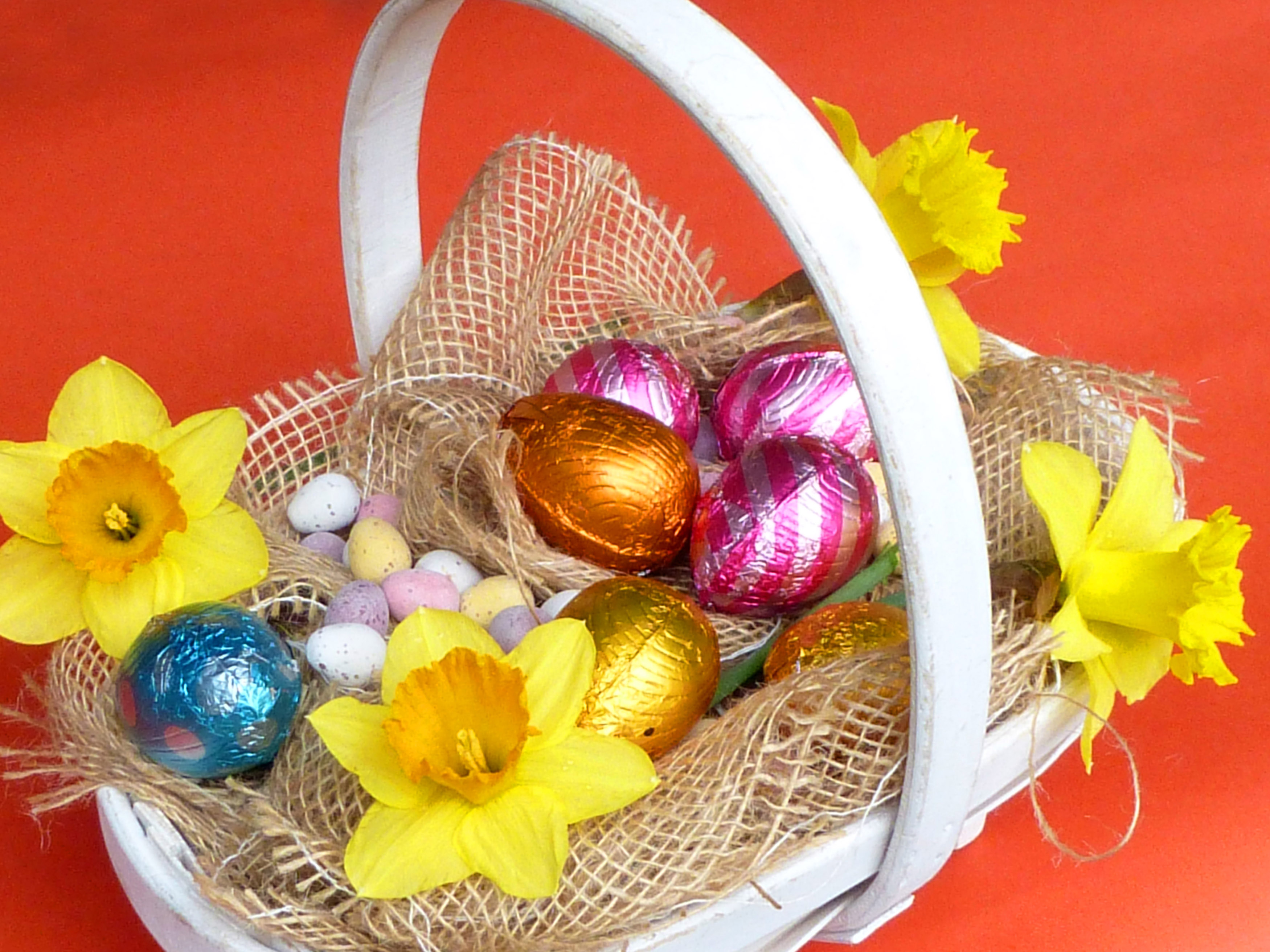 Keywords: candies, chocolate, easter, eggs, quail eggs, spring, flowers, foil, sweet, basket, sack, festive, daffodils, candy, holiday