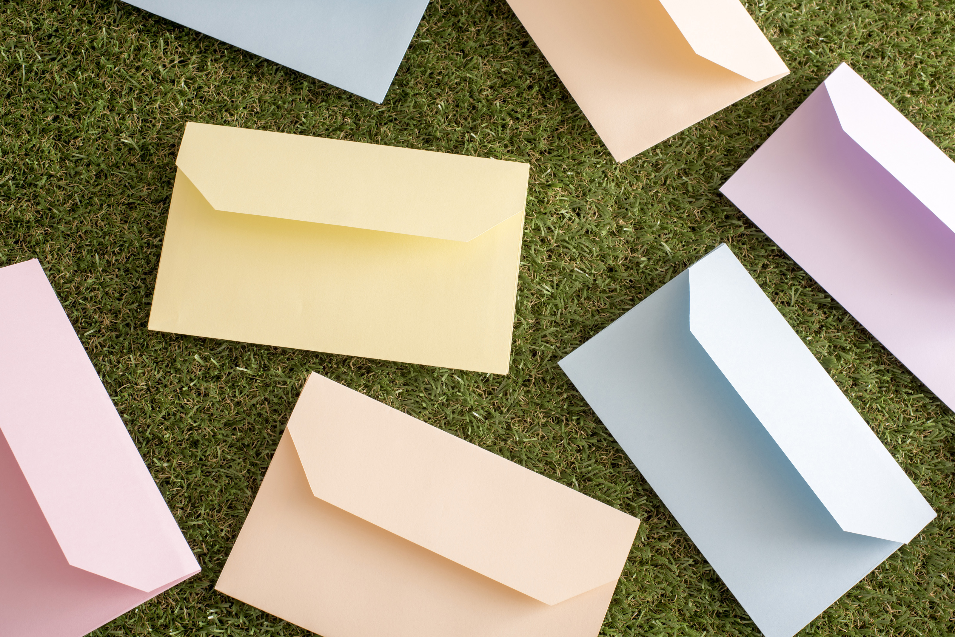Colorful scattered envelopes for Easter greetings lying flap side up on green grass in a full frame background