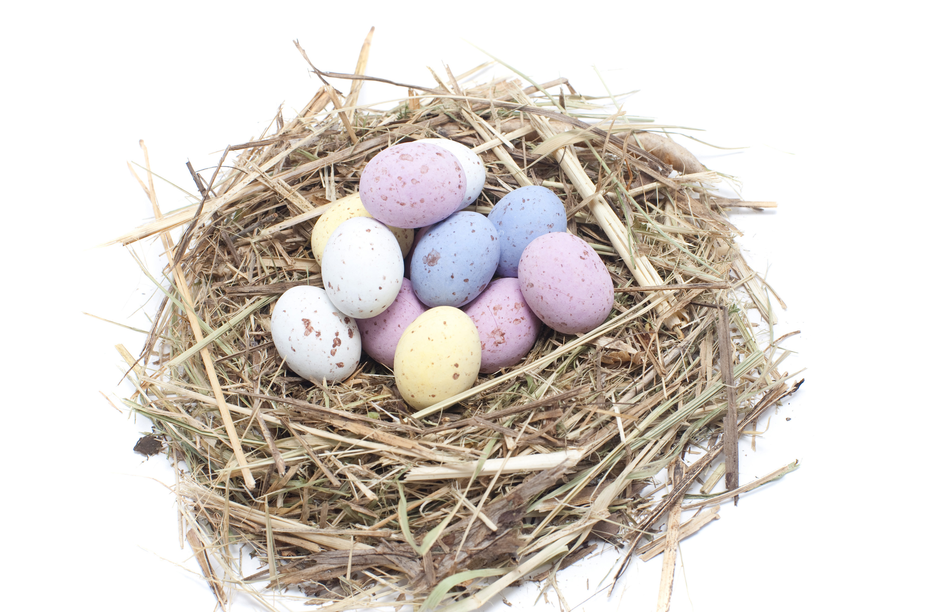 Keywords: holiday, nest, colourful, celebration, sweet, candy, celebrate, easter, straw, confectionery, pastel, on white, easter egg, sugared, mini eggs